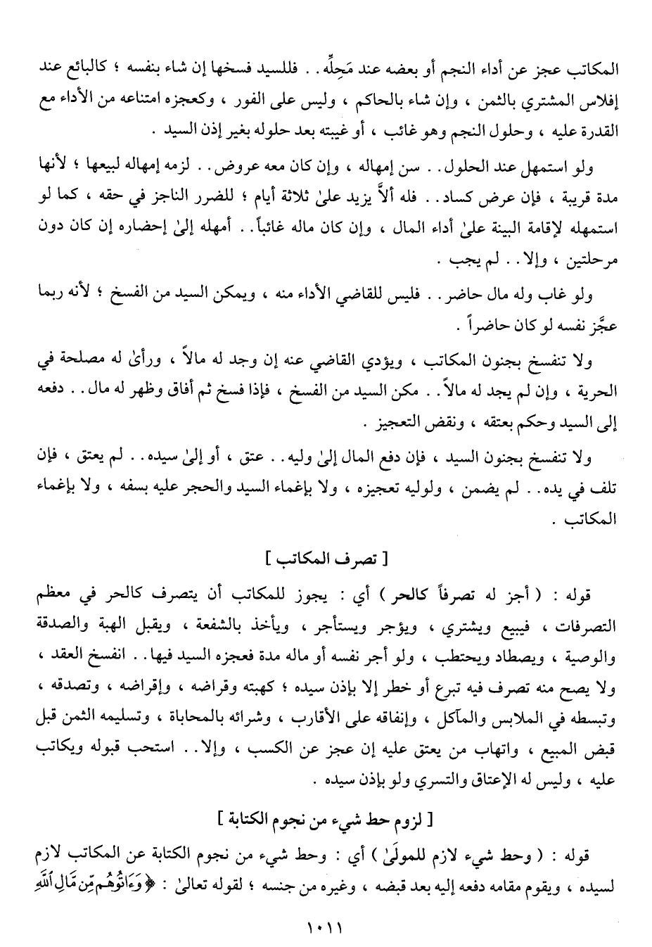 قوله: (أجز له تصرفاً كالحر) أي: يجوز للمكاتب أن يتصرف كالحر في معظم التصرفات، فيبيع ويشترى، ويؤجر ويستأجر، ويأخذ بالشفعة، ويقبل الهبة والصدقة والوصية، ويصطاد ويحتطب، ولو أجر نفسه أو ماله مدة فعجزه السيد فيها .. انفسخ العقد، ولا يصح منه تصرف فيه تبرع أو خطر إلا بإذن سيده؛ كهبته وقراضه، وإقراضه، وتصدقه وتبسطه في الملابس والمآكل، وإنفاقه على الأقارب، وشرائه بالمحاباة، وتسليمه الثمن قبل قبض المبيع، واتهاب من يعتق عليه إن عجز عن الكسب، وإلا .. استحب قبوله ويكاتب عليه، وليس له الإعتاق والتسري ولو بإذن سيده.
