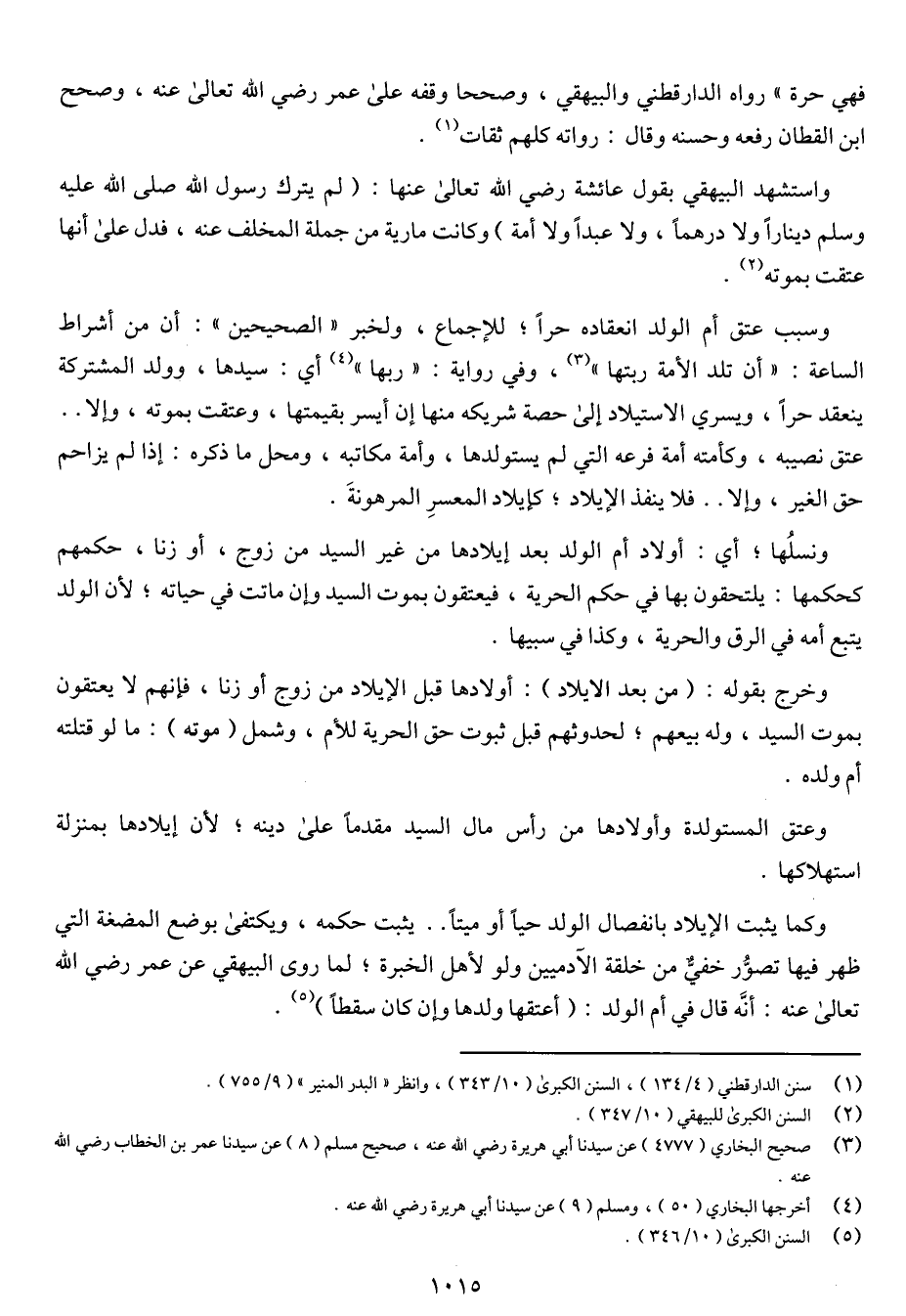 فهي حرة" رواه الدارقطني والبيهقي، وصححا وقفه على عمر رضى الله تعالى عنه، وصحح ابن القطان رفعه وحسنه وقال: رواته كلهم ثقات.