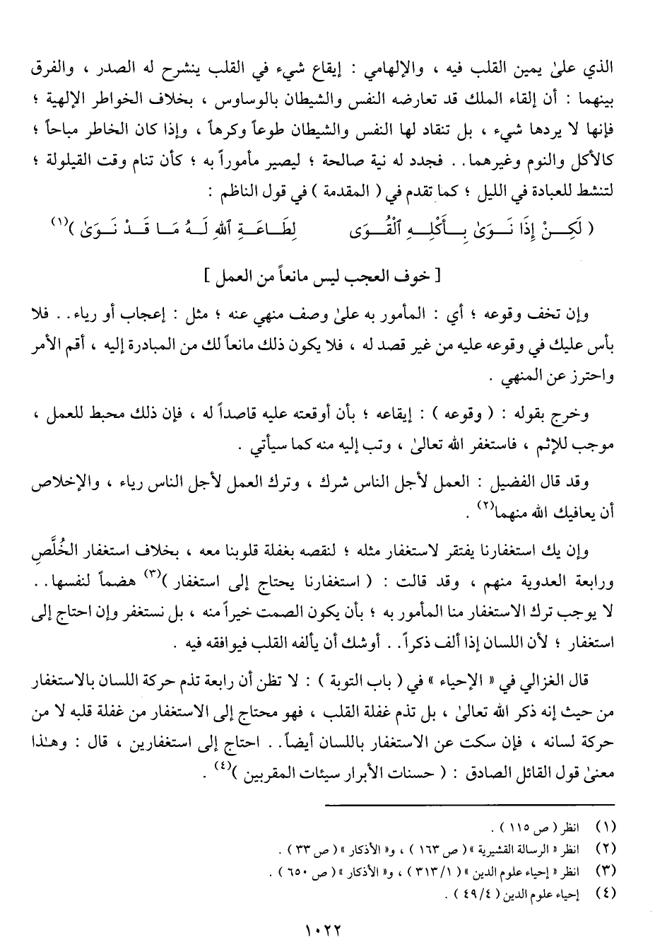 الذي على يمين القلب فيه، والإلهامي: إيقاع شيء في القلب ينشرح له الصدر، والفرق بينهما: أن إلقاء الملك قد تعارضه النفس والشيطان بالوساوس، بخلاف الخواطر الإلهية؛ فإنها لا يردها شيء، بل تنقاد لها النفس والشيطان طوعاً وكرهاً، وإذا كان الخاطر مباحاً؛ كالأكل والنوم وغيرهما .. فجدد له نية صالحة؛ ليصير مأموراً به؛ كأن تنام وقت القيلولة؛ لتنشط للعبادة في الليل؛ كما تقدم في (المقدمة) في قول الناظم: