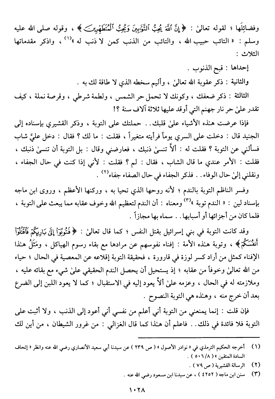 فإذا عرضا هذه الأشياء على قلبك .. حملتك على التوبة، وذكر القشيري بإسناده إلى الحنيد قال: دخلت على السري يوماً فرأيته متغيراً، فقلت: مالك؟ فقال: دخل علي شاب فسألني عن التوبة؟ فقلت له: ألا تنسى ذنبك، فعارضني وقال: بل التوبة أن تنسى ذنبك، فقلت: الأمر عندي ما قال الشاب، فقال: لم؟ فقلت: لأني إذا كنت في حال الجفاء، ونقلني إلى حال الوفاء .. فذكر الجفاء في حال الصفاء جفاء.