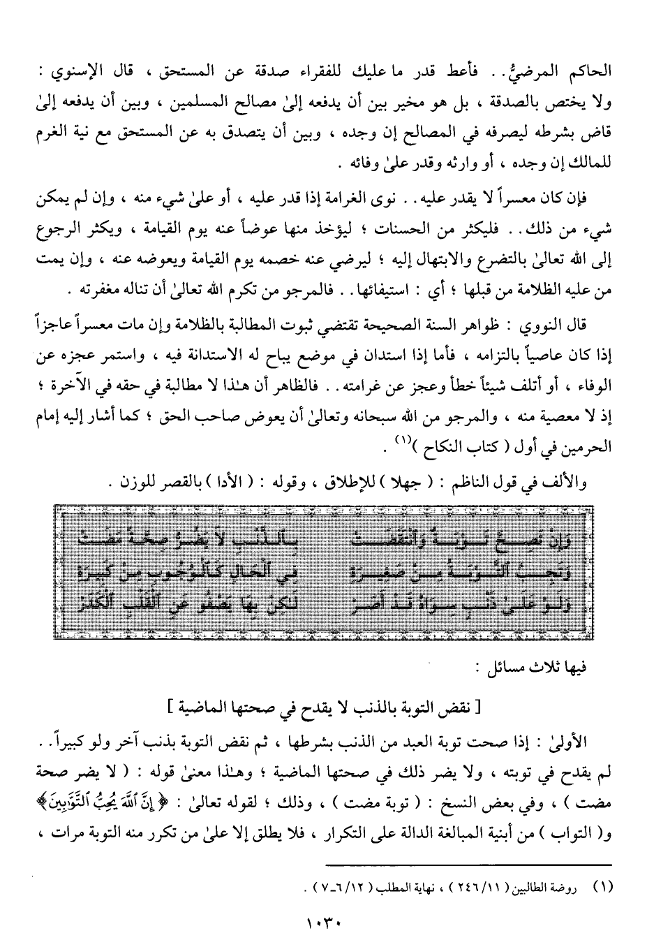 الأولى: إذا صحت توبة العبد من الذنب بشرطها، ثم نقض التوبة بذنب آخر ولو كبيراً .. لم يقدح في توبته، ولا يضر ذلك في صحتها الماضية؛ هذا معنى قوله: (لا يضر صحة مضت)، وفي بعض النسخ: (توبة مضت)، وذلك؛ لقوله تعالى: {إن الله يحب التوابين} و (التواب) من أبنية المبالغة الدالة على التكرار، فلا يطلق إلا على من تكرر منه التوبة مرات،