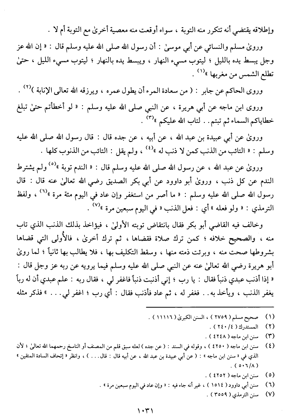وروى عن عبد الله، عن رسول الله صلى الله عليه وسلم قال: "الندم توبة" ولم يشترط الندم عن كل ذنب، وروى أبو داوود عن أبي بكر الصديق رضي الله تعالى عنه قال: قال رسول الله صلى الله عليه وسلم: "ما أصر من استغفر وإن عاد في اليوم مئة مرة"، ولفظ الترمذي: "ولو فعله" أي: فعل الذنب "في اليوم سبعين مرة".