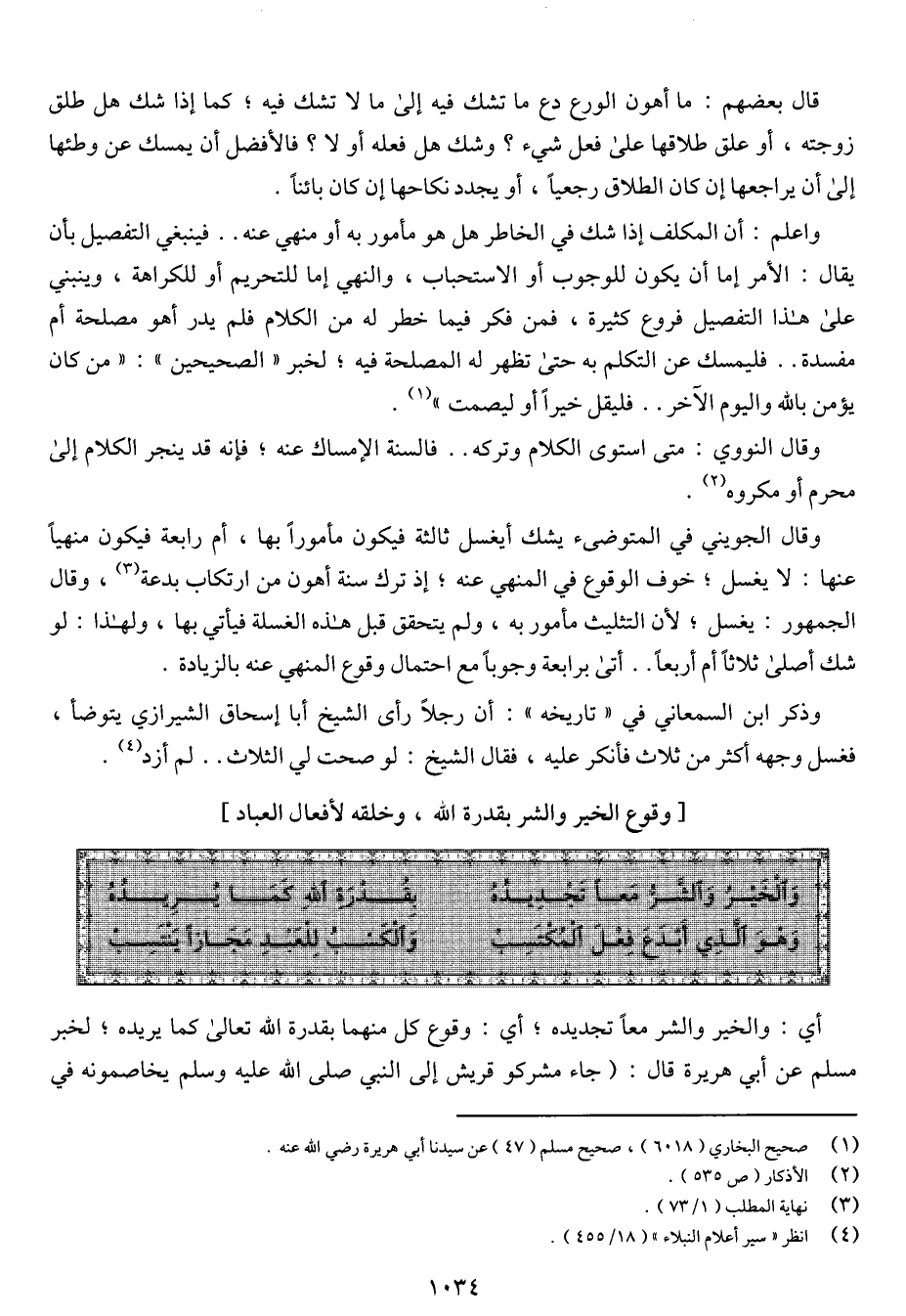 واعلم: أن المكلف إذا شك في الخاطر هل هو مأمور به أو منهي عنه .. فينبغي التفصيل بأن يقال: الأمر إما أن يكون للوجوب أو الاستحباب، والنهي إما للتحريم أو للكراهة، وينبني على هذا التفصيل فروع كثيرة، فمن فكر فيما خطر له من الكلام فلم يدر أهو مصلحة أم مفسدة .. فليمسك عن التكلم به حتى تظهر له المصلحة فيه؛ لخبر "الصحيحين": "من كان يؤمن بالله واليوم الآخر .. فليقل خيراً أو ليصمت".