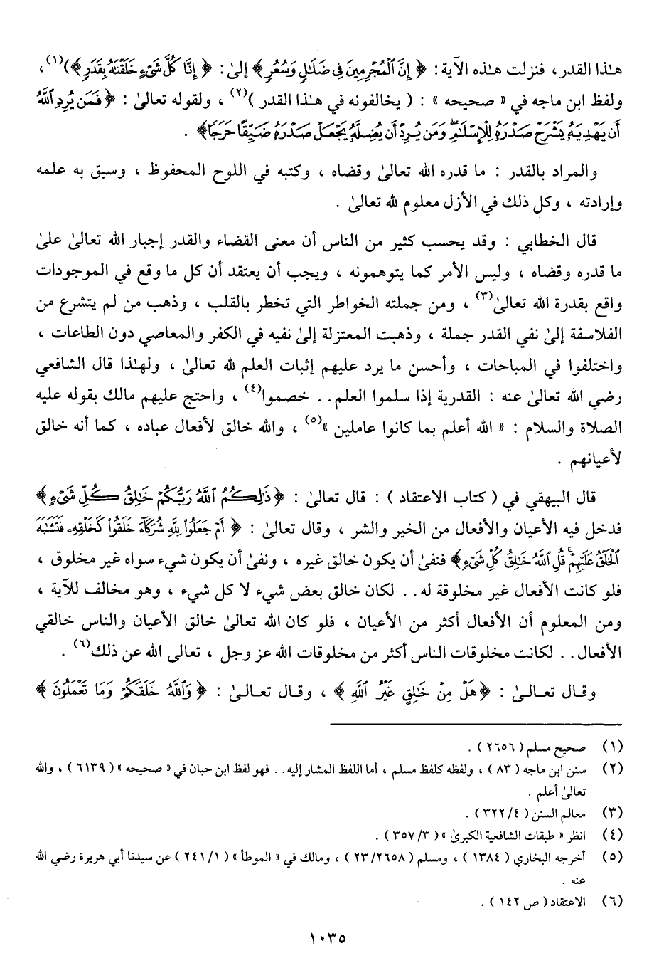 قال البيهقي في (كتاب الاعتقاد): قال تعالى: {ذالكم الله ربكم خلق كل شيء} فدخل فيه الأعيان والأفعال من الخير والشر، وقال تعالى: {أم جعلوا لله شركاء خلقوا كخلقه فتشبه الخلق عليهم قل الله خلق كل شيء} فنفى أن يكون خالق غيره، ونفى أن يكون شيء سواه غير مخلوق، فلو كانت الأفعال غير مخلوقة له .. لكان خالق بعض شيء لا كل شيء، وهو مخالف للآية، ومن المعلوم أن الأفعال أكثر من الأعيان، فلو كان الله تعالى خالق الأعيان والناس خالقي الأفعال .. لكانت مخلوقات الناس أكثر من مخلوقات الله عز وجل، تعالى الله عن ذلك.