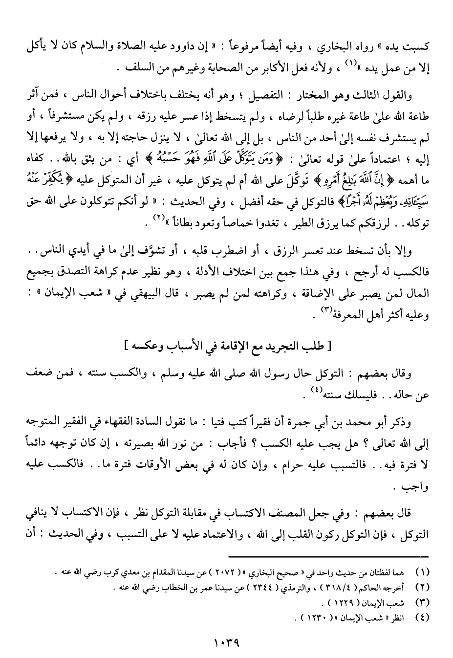 والقول الثالث وهو المختار: التفصيل؛ وهو أنه يختلف باختلاف أحوال الناس، فمن آثر طاعة الله على طاعة غيره طلباً لرضاه، ولم يتسخط إذا عسر عليه رزقه، ولم يكن مستشرفاً، أو لم يستشرف نفسه إلى أحد من الناس، بل إلى الله تعالى، لا ينزل حاجته إلا به، ولا يرفعها إلا إليه؛ اعتماداً على قوله تعالى: {ومن يتوكل على الله فهو حسبه} أي: من يثق بالله .. كفاه ما أهمه {إن الله بلغ أمره} توكل على الله أم لم يتوكل عليه، غير أن المتوكل عليه {يكفر عنه سيئاته ويعظم له أجراً} فالتوكل في حقه أفضل، وفي الحديث: "لو أنكم تتوكلون على الله حق توكله .. لرزقكم كما يرزق الطير، تغدوا خماصاً وتعود بطاناً".