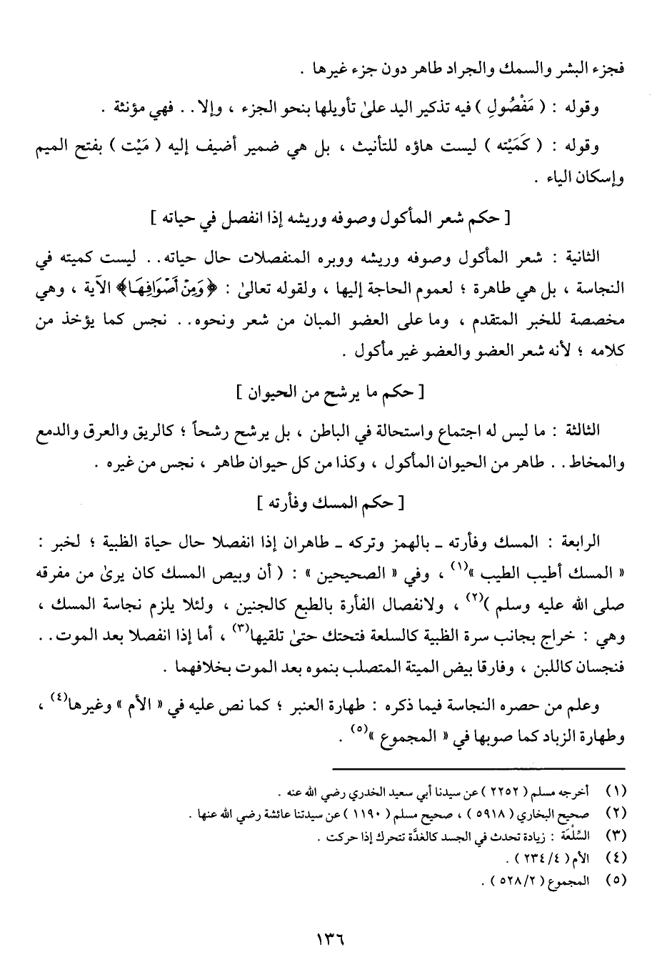 الرابعة: المسك وفأرته - بالهمزة وتركه - طاهران إذا انفصلا حال حياة الظبية؛ لخبر: "المسك أطيب الطيب"، وفي "الصحيحين": (أن وبيص المسك كان يرى من مفرقه صلى الله عليه وسلم)، ولانفصال الفأرة بالطبع كالجنين، ولئلا يلزم نجاسة المسك، وهي: خراج بجانب سرة الظبية كالسلعة فتحتك حتى تلقيها، أما إذا انفصلا بعد الموت .. فنجسان كاللبن، وفارقا بيض الميتة المتصلب بنموه بعد الموت بخالفهما.