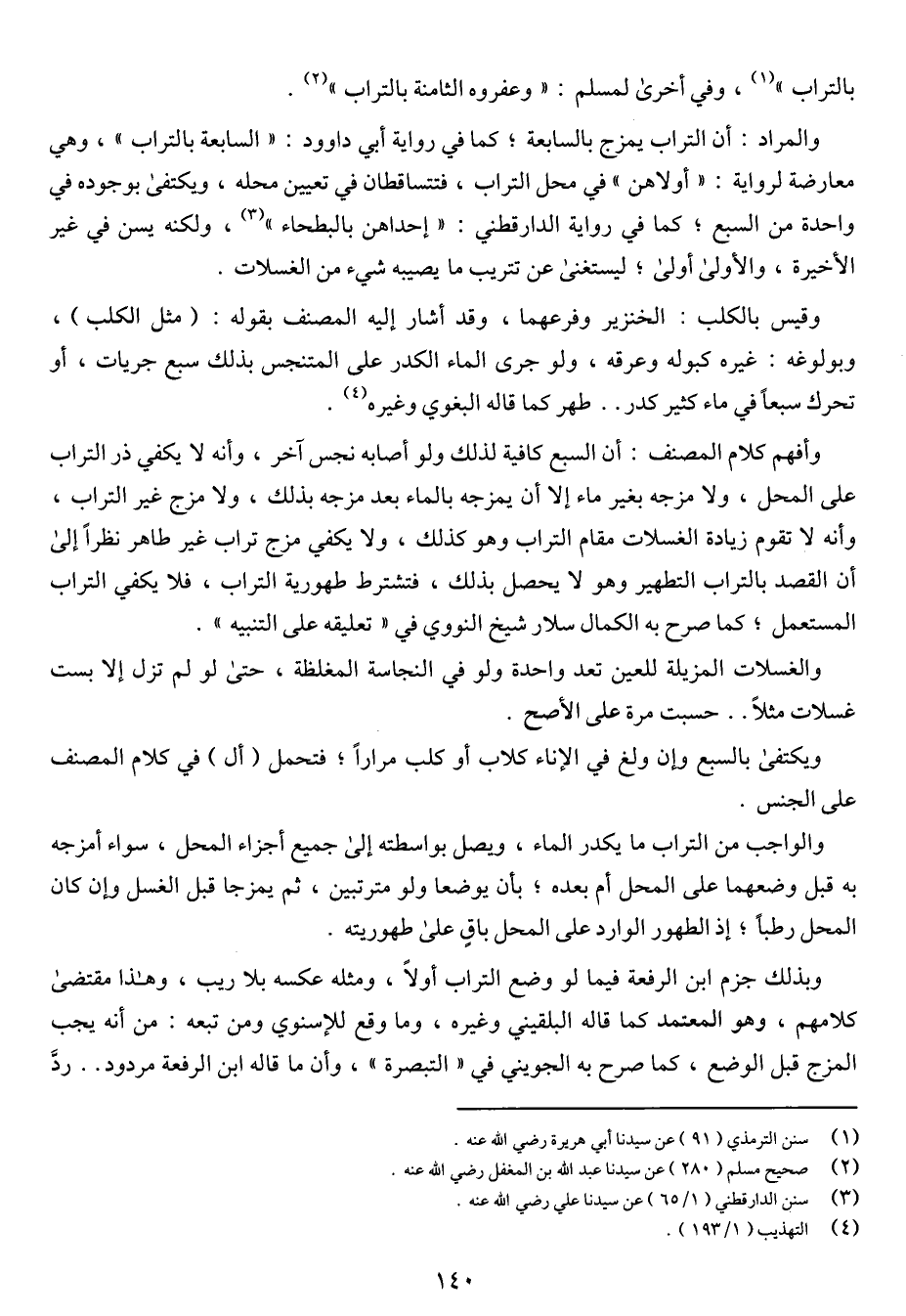 وأفهم كلام المصنف: أن السبع كافية لذلك ولو أصابه نجس آخر، وأنه لا يكفي ذر التراب على المحل، ولا مزجه بغير ماء إلا أن يمزجه بالماء بعد مزجه بذلك، ولا مزج غير التراب، وأنه لا تقول زيادة الغسلات مقام التراب وهو كذلك، ولا يكفي مزج تراب غير طاهر نظراً إلى أن القصد بالتراب التطهير وهو لا يحصل بذلك، فتشترط طهورية التراب، فلا يكفي التراب المستعمل؛ كما صرح به الكمال سلار شيخ النووي في "تعليقه على التنبيه".