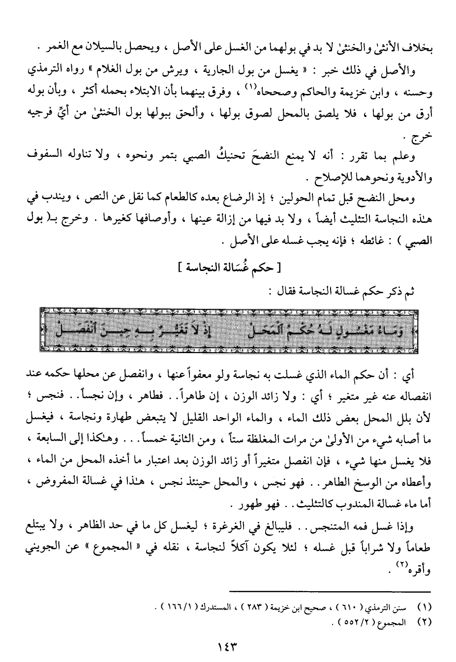 ومحل النضج قبل تمام الحولين؛ إذ الرضاع بعده كالطعام كما نقل عن النص، ويندب في هذه النجاسة التثليث أيضاً، ولابد فيها من إزالة عينها، وأوصافها كغيرها. وخرج بـ (نبول الصبي): غائطه؛ فإنه يجب غسل على الأصل.