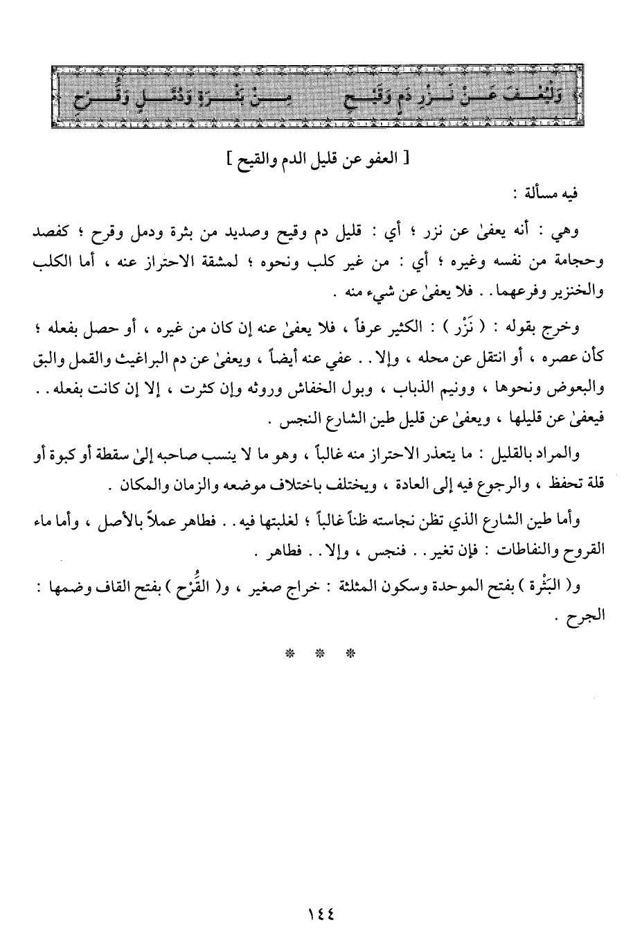 (وليُعف عن نزر دمٍ وقيح ... من بثرةٍ ودُمَّلٍ وقرح)