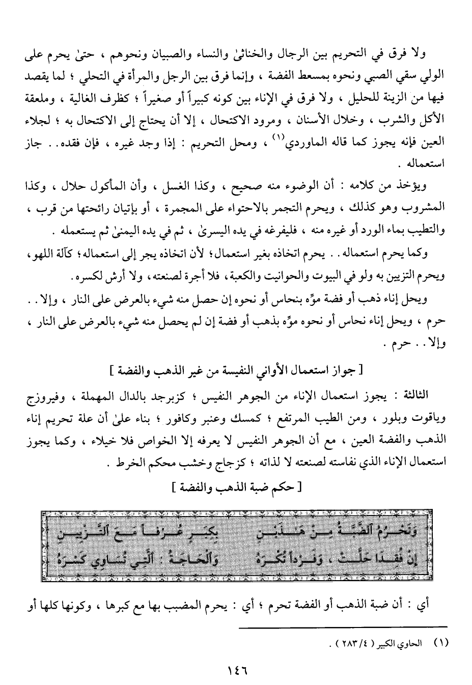 ولا فرق في التحريم بين الرجال والخناثى والنساء والصبيان ونحوهم، حتى يحرم على الولي سقي الصبي ونحوه بمسعط الفضة، وإنما فرق بين الرجل والمرأة في التحلي؛ لما يقصد فيها من الزينة للتحليل، ولا فرق في الإناء بين كونه كبيراً أو صغيراً؛ كظرف الغالية، وملعقة الأكل والشرب، وخلال الأسنان، ومردود الاكتحال، إلا أن يحتاج إلى الاكتحال به؛ لجلاء العين فإنه يجوز كما قاله الماوردي، ومحل التحريم: إذا وجد غيره، فإن فقده .. جاز استعماله.