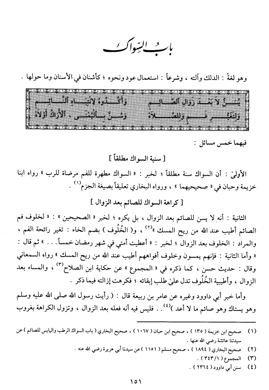 (ولِتغيُّر فمٍ وللصلاة ... وسنَّ باليمنى، الأراك أولاه)