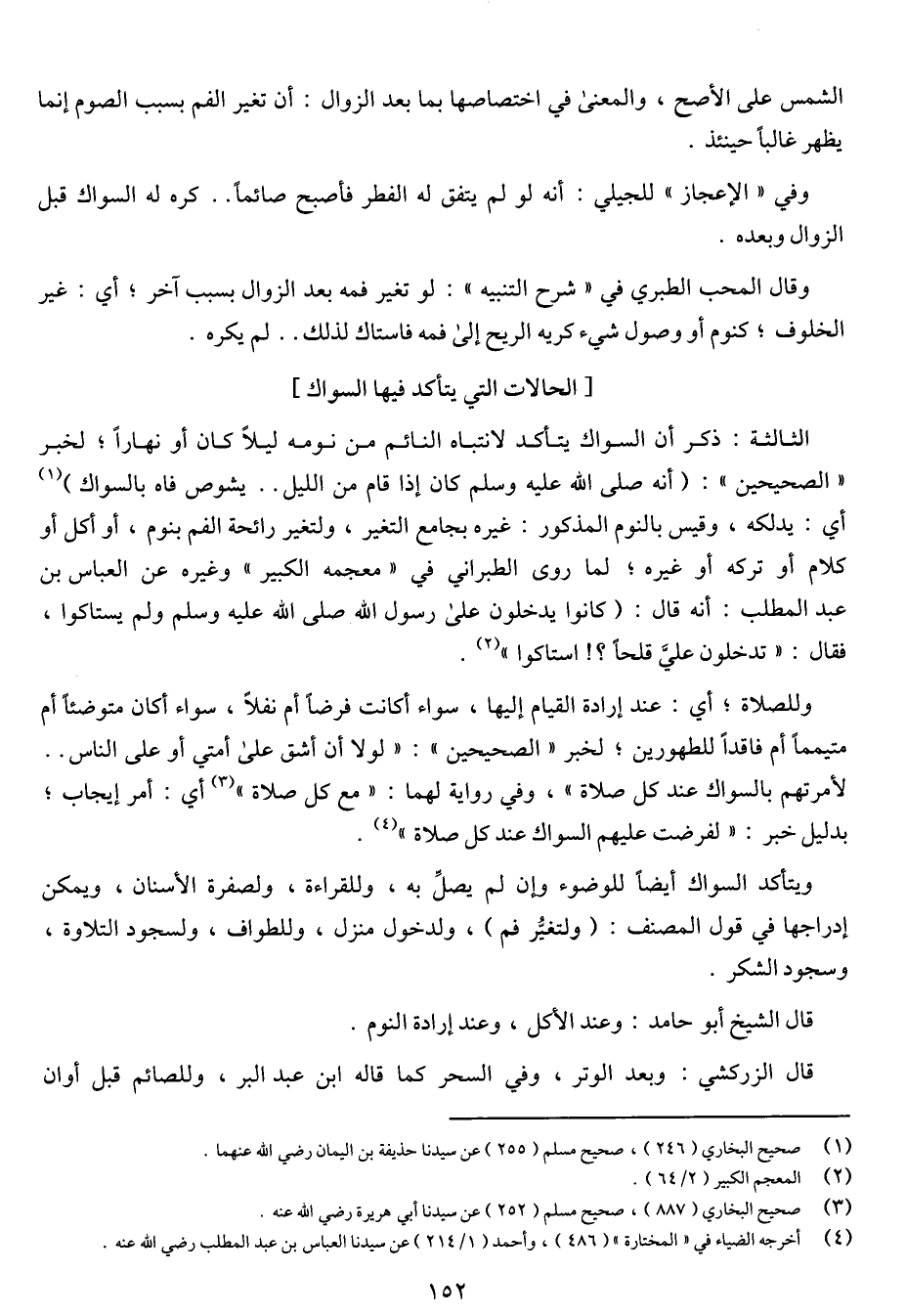 الثالثة: ذكر أن السواك يتأكد لانتباه النائم من نومه ليلاً كان أو نهاراً؛ لخبر "الصحيحين": (أنه صلى الله عليه وسلم كان إذا قام من الليل .. يشوص فاه بالسواك) أي: يدلكه، وقيس بالنوم المذكور: غيره بجامع التغير، ولتغير رائحة الفم بنوم، أو أكل أو كلام أو تركه أو غيره؛ لما روى الطبراني في "معجمه الكبير" وغيره عن العباس بن عبد المطلب: أنه قالك (كانوا يدخلون على رسول الله صلى الله عليه وسلم ولم يستاكوا، فقال: "تدخلون عليَّ قلحاً؟ ! استاكوا".