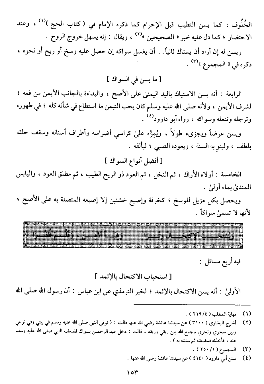 الأولى: أنه يسن الاكتحال بالإثمد؛ لخبر الترمذي عن ابن عباس: أن رسول الله صلى الله