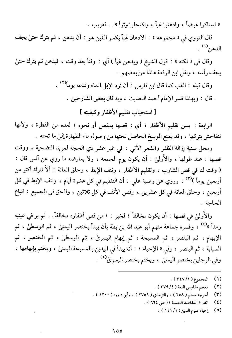 الرابعة: يسن تقليم الأظفار؛ أي: قصها بمقص أو نحوه؛ لعده من الفطرة، ولأنها تتفاحش بتركها، وقد تمنع الوسخ الحاصل تحتها من وصول ماء الطهارة إلى ما تحته.