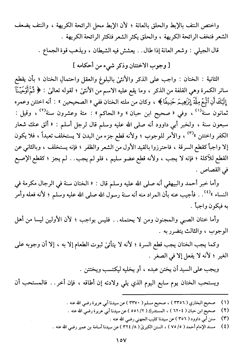الثانية: الختان: واجب على الذكر والأنثى بالبلوغ والعقل واحتمال الختان؛ بأن يقطع ساتر الكمرة وهي القلفة من الذكر، وما يقع عليه الاسم من الانثى، لقوله تعالى: {ثم أوحينا إليك أن اتبع ملة إبراهيم حنيفاً}، وكان من ملته الختان ففي "الصحيحين": أنه اختتن وعمره ثمانون سنة، وفي "صحيح ابن حبان" و "الحاكم": مئة وعشرون سنة، وقيل: سبعون سنة، ولخبر أبي داود أنه صلى الله عليه وسلم قال لرجل أسلم: "الق عنك شعار الكفر واختتن"، والأمر للوجوب؛ ولأنه قطع جزء من البدن لا يستخلف بعبداً، فلا يكون إلا واجباً كقطع السرقة، فاحترزوا بالقيد الأول من الشعر والظفر؛ فإنه يستخلف، وبالثاني عن القطع للآكلة؛ فإنه يجب، ولأنه قطع كعضو سليم، فلو لم يجب .. لم يجز؛ كقطع الإصبع في القصاص.