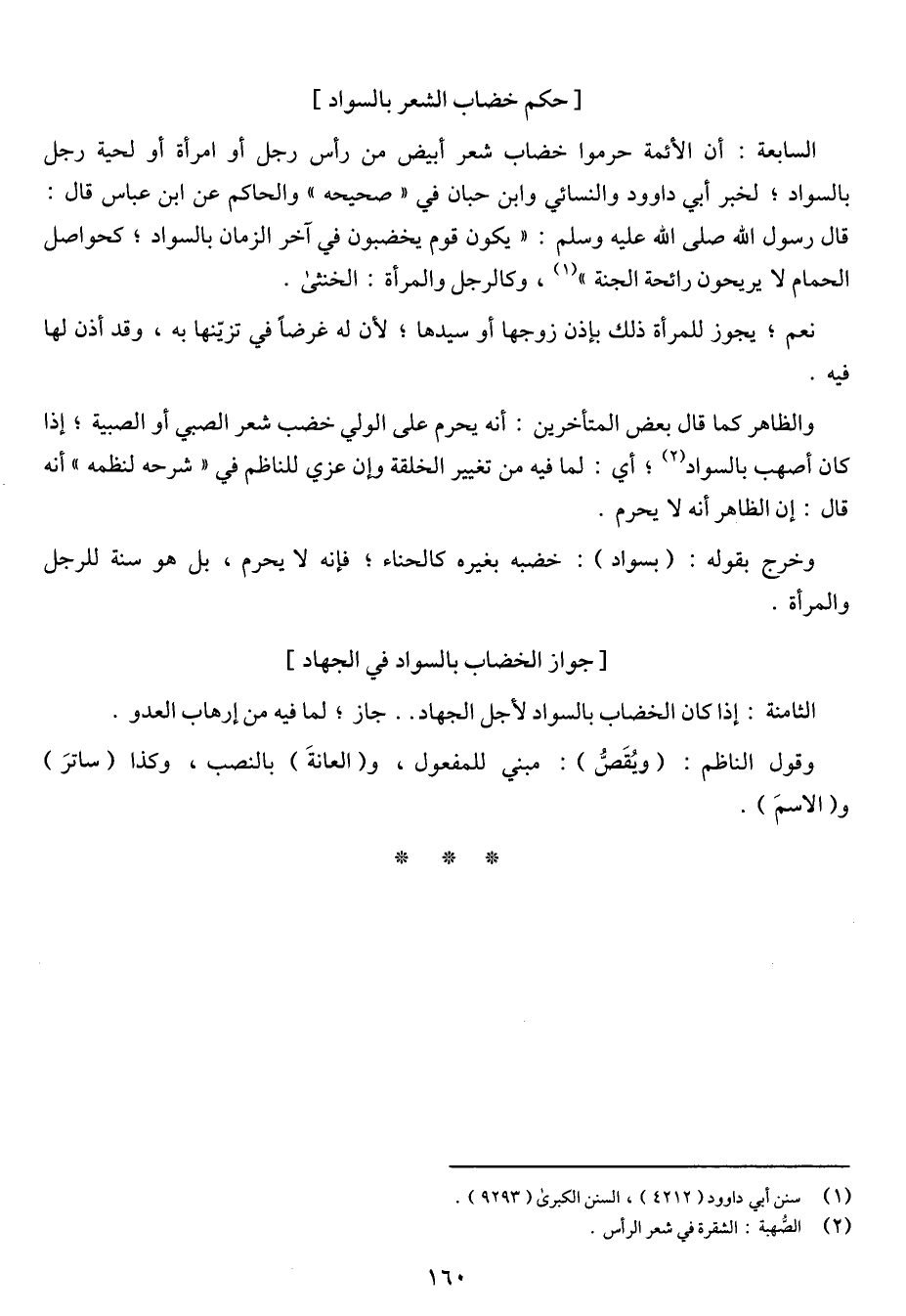 السابعة: أن الأئمة حرموا خضاب شعر أبيض من رأس رجل أو امرأة أو لحية رجل بالسواد؛ لخبر أبي داود والنسائي وابن حبان في "صحيحه" والحاكم عن ابن عباس قال: قال رسول الله صلى الله عليه وسلم: "يكون قوم يخضبون في آخر الزمان بالسواد؛ كحواصل الحمام لا يريحون رائحة الجنة"، وكالرجل والمرأة: الخنثى.