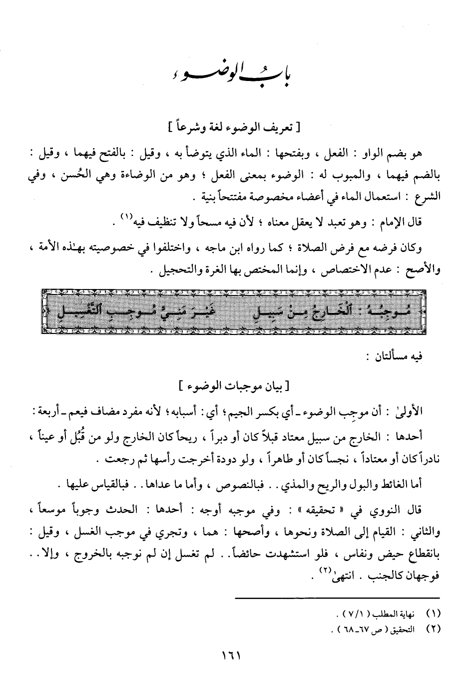 هو بضم الواو: الفعل، وبفتحها: الماء الذي يتوضأ به، وقيل: بالفتح فيهما، وقيل: بالضم فيهما، والمبوب له: الوضوء بمعنى الفعل؛ وهو من الوضاءة وهي الحُسن، وفي الشرع: استعمال الماء في أعضاء مخصوصة مفتتحاً بنية.