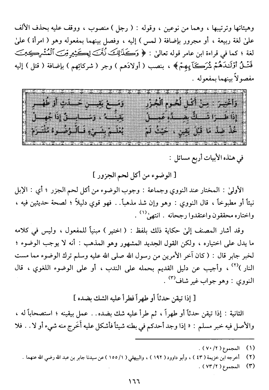 الأولى: المختار عند النووي وجماعة: وجوب الوضوء من أكل لحم الجزر؛ أي: الإبل نيئاً أو مطبوخاً، قال النووي: وهو وإن شذ مذهباً .. فهو قوي دليلاً؛ لصحة حديثين فيه، واختياره محققون واعتقدوا رجحانه. انتهى.