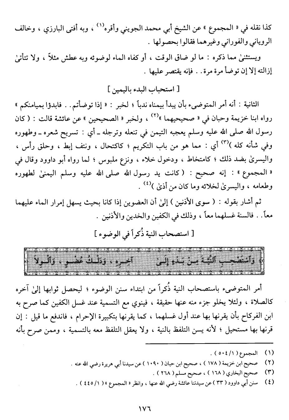 الثانية: أنه أمر المتوضئ بأن يبدأ بيمناه ندباً؛ لخبر: "إذا توضأتم .. فابدؤا بميامنكم" رواه أينا خزيمة وحبان في "صحيحيهما"، ولخبر "الصحيحين" عن عائشة قالت: (كان رسول الله صلى الله عليه وسلم يعجبه التيمن في تنعله وترجله - أي: تسريح شعره - وطهوره وفي شأنه كله) أي: مما هو من باب التكريم؛ كاكتحال، ونتف إبط، وحلق رأس، واليسرى بضم ذلك؛ كامتخاط، ودخول خلاء، ونزع ملبوس؛ لما رواه أبو داود وقال في "المجموع": إنه صحيح: (كانت يد رسول الله صلى الله عليه وسلم اليمنى لطهوره وطعامه، واليسرى لخلائه وما كان من أذى).