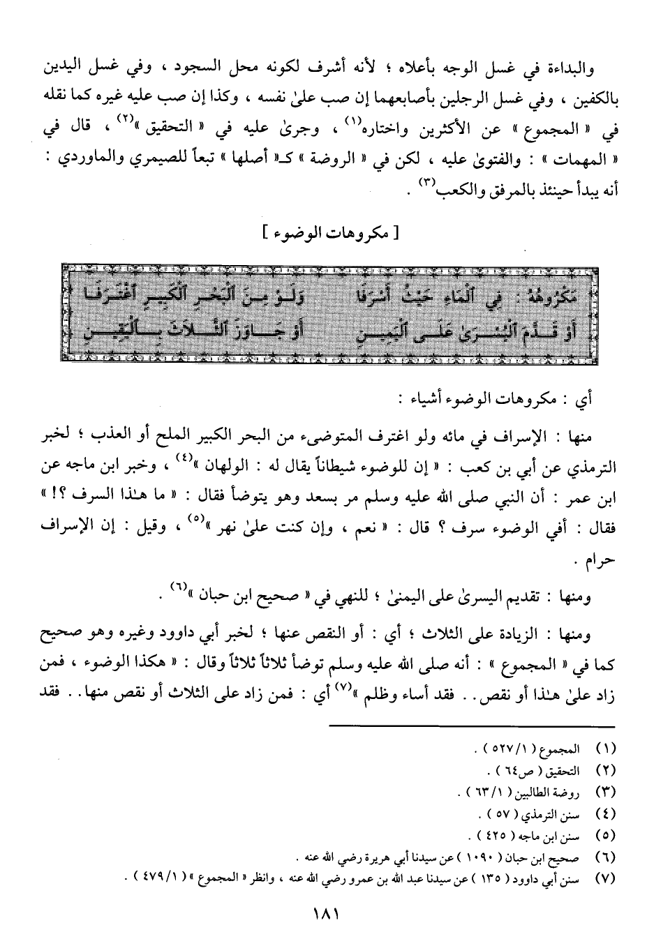 منها: الإسراف في مائه ولو اغترف المتوضئ من البحر الكبير الملح أو العذب؛ لخبر الترمذي عن أبي بن كعب: "إن للوضوء شيطاناً يقال له: الولهان"، وخبر ابن ماجه عنه ابن عمر: أن النبي صلى الله عليه وسلم مر بسعد وهو يتوضأ فقال: طما هذا السرف؟ ! " فقال: أفي الوضوء سرف؟ قال: "نعم، وإن كنت على نهر"، وقيل: إن الإسراف حرام.