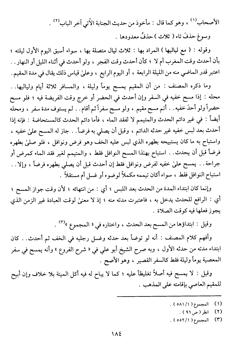 وما ذكره المصنف: من أن المقيم يمسح يوماً وليلة، والمسافر ثلاثة أيام ولياليها .. محله: إذا مسح خفية في السفر وإن أحدث في الحضر أو خرج وقت الفريضة فيه؛ فلو مسح حضراً ولو أحدَ خفيه .. أتم مسح مقيم، ولو مسح سفراً ثم أقام .. لم يستوف مدة سفر، ومحله أحدث بعد لبس خفيه غير حدثه الدائم، وقبل أن يصلي به فرضاً .. جاز له المسح على خفيه، واستباح به ما كان يستبيحه بطهره الذي لبس عليه الخف وهو فرض ونوافل، فلو صلى بطهره فرضاً قبل أن يحدث .. استباح بهذا المسح النوافل فقط، والتيمم لغير فقد الماء كمرض أو جراحة .. يمسح على خفية لفرض ونوافل فقط إن أحدث قبل أن يصلي بطهره فرضاً، وإلا .. استباح النوافل فقط، سواء أكان تيممه مكملاً لوضوء أو غسل أم مستقلاً.