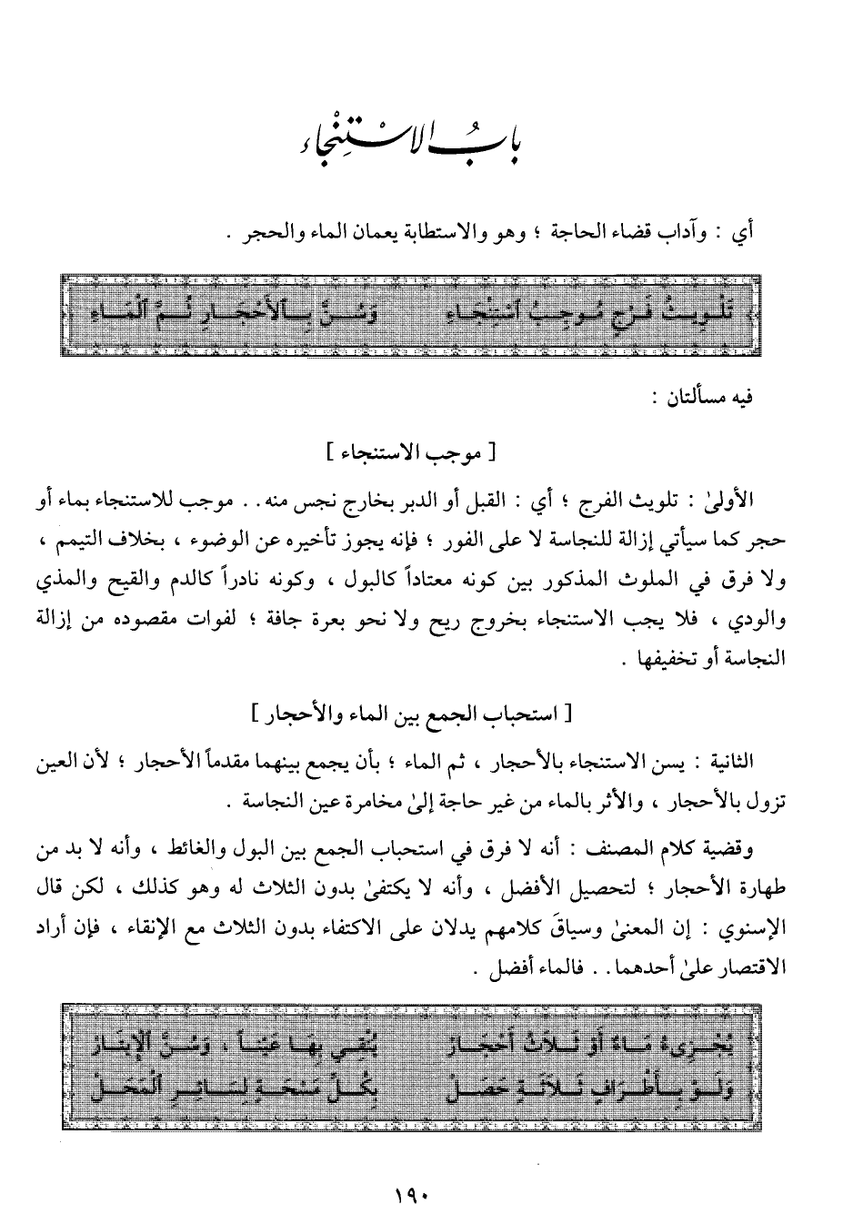 (تلويث فرجٍ موجبُ استنجاء ... وسُنَّ بالأحجار ثم الماء)