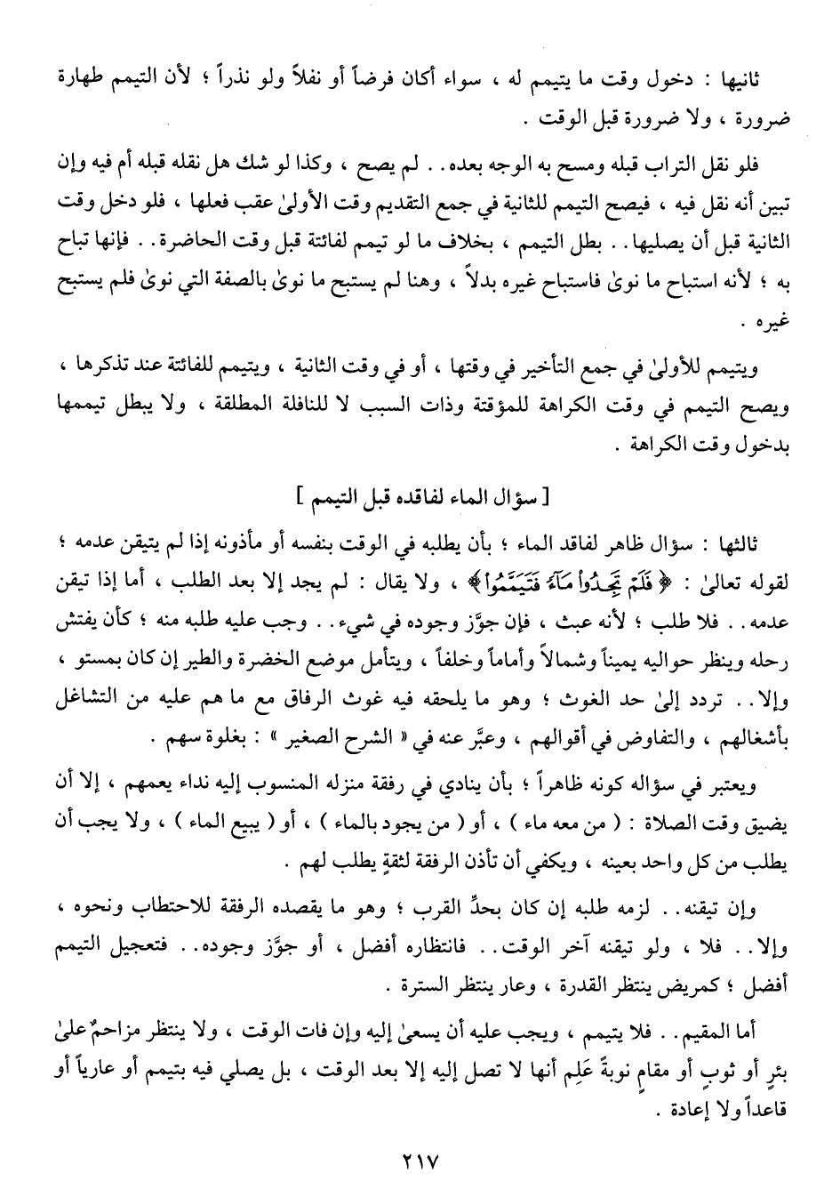 ثالثها: سؤال ظاهر لفاقد الماء؛ بأن يطلبه في الوقت بنفسه أو مأذونه إذا لم يتيقن عدمه؛ لقوله تعالى: {فلم تجدوا ماءً فتيمموا}، ولا يقال: لم يجد إلا بعد الطلب، أما إذا تيقن عدمه .. فلا طلب؛ لأنه عبث، فإن جوَّز وجوده في شيء .. وجب عليه طلبه منه؛ كأن يفتش رحلة وينظر حواليه يميناً وشمالاً وأماماً وخلفاً، ويتأمل موضع الخضرة والطيران إن كان بمستو، وإلا .. تردد إلى حد الغوث؛ وهو ما يلحقه فيه غوث الرفاق مع ما هم عليه من التشاغل بأشغالهم، والتفاوض في أقوالهم، وعبَّر عنه في "الشرح الصغير": بغلوة سهم.