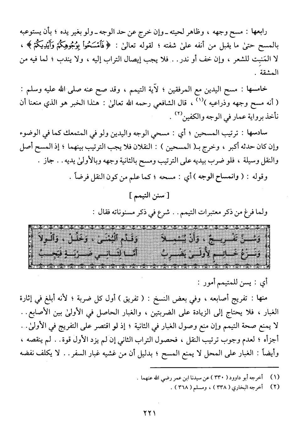 خامسها: مسح اليدين مع المرفقين؛ لآية التيمم، وقد صح عنه صلى الله عليه وسلم: (انه مسح وجهه وذراعيه)، قال الشافعي رحمه الله تعالى: هذا الخبر هو الذي منعنا أن نأخذ برواية عمار في الوجه والكفين.