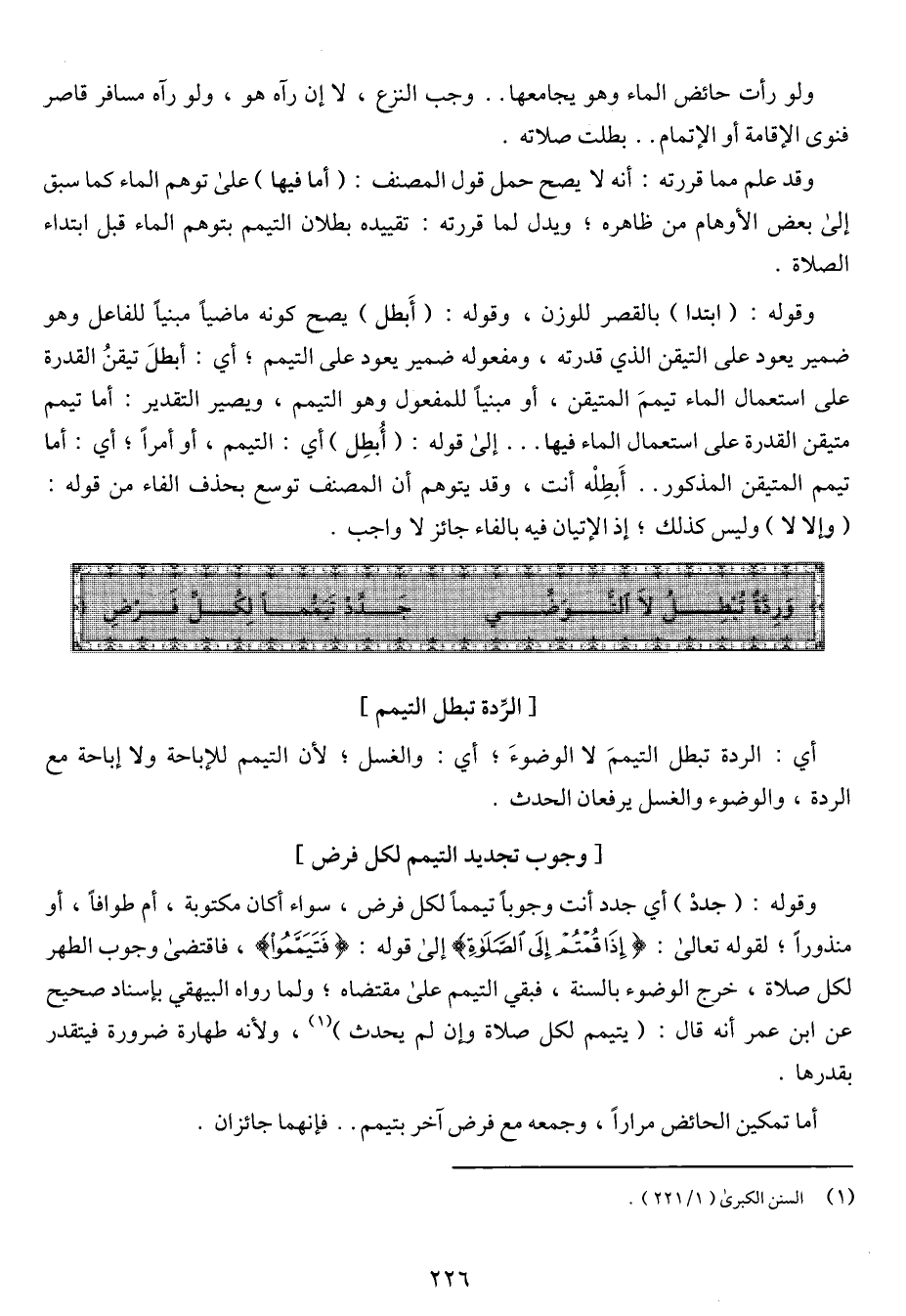 ولو رأت حائض الماء وهو يجامعها .. وجب النزع، لا إن رآه هو، ولو رآه مسافر قاصر فنوى الإقامة أو الإتمام .. بطلت صلاته.