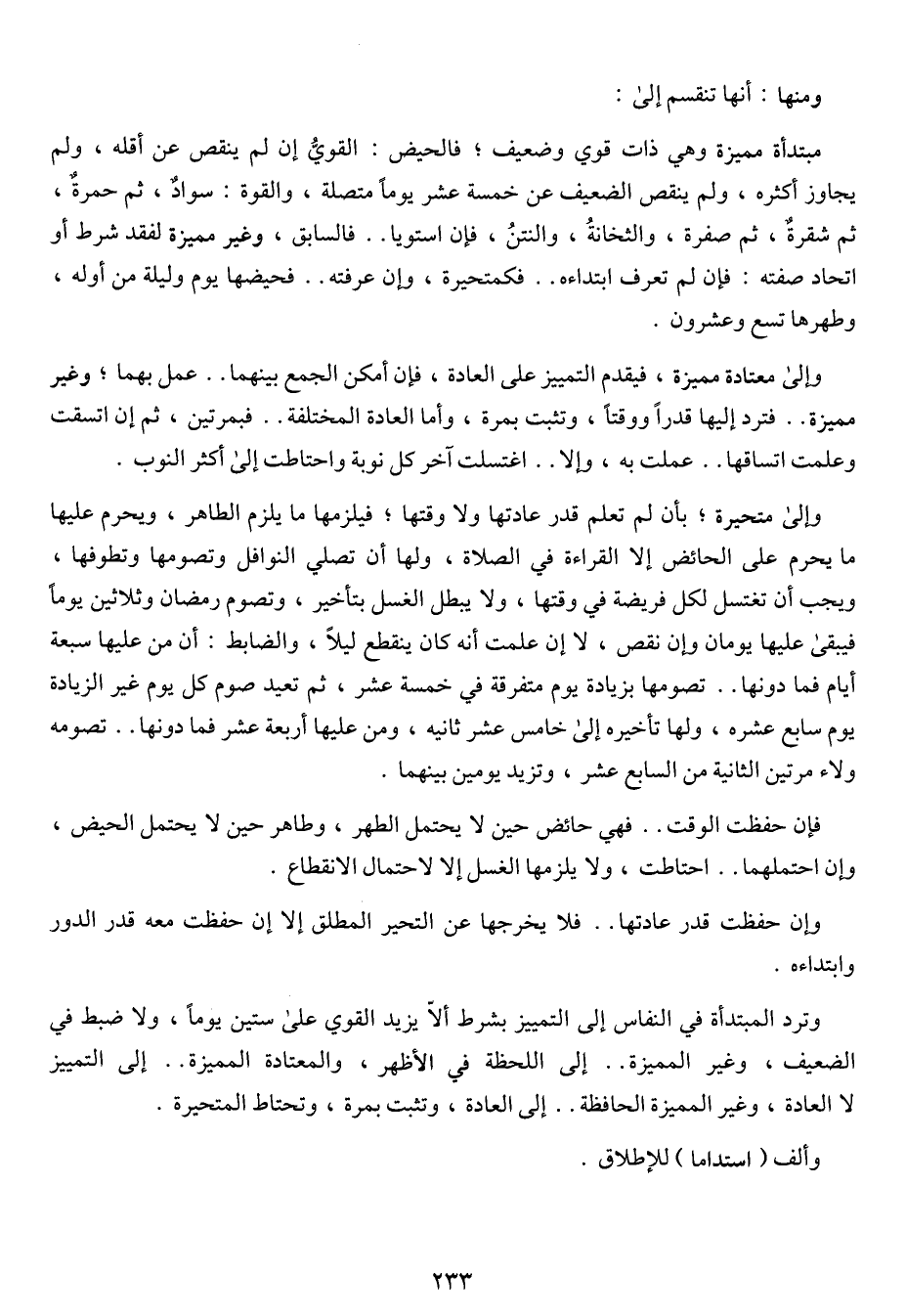 مبتدأة مميزة وهي ذات قوي وضعيف؛ فالحيض: القوي إن لم ينقص عن أقله، ولم يجاوز أكثره، ولم ينقص الضعيف عن خمسة عشرة يوماً متصلة، والقوة: سوادٌ، ثم حمرةٌ، ثم شقرةٌ، ثم صفرة، والثخانة، والنتن، فإن استويا .. فالسابق، وغير مميزة لفقد شرط أو اتحاد صفته: فإن لم تعرف ابتداءه .. فكمتحيرة، وإن عرفته .. فحيضها يوم وليلة من أوله، وطهرها تسع وعشرون.