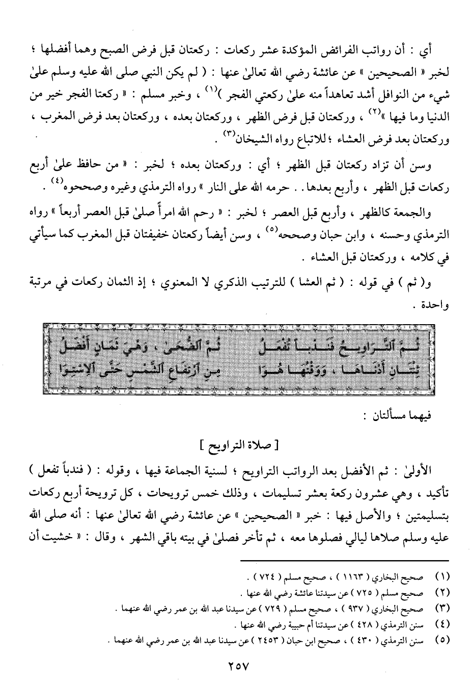 الأولى: ثم الأفضل بعد الرواتب والتراويح؛ لسنية الجماعة فيها، وقوله: (فندبا تفعل) تأكيد، وهي عشرون ركعة بعشر تسليمات، وذلك خمس ترويحات، كل ترويحة أربع ركعات بتسليمتين؛ والأصل فيها: خبر "الصحيحين" عن عائشة رضي الله تعالى عنها: أنه صلى الله عليه وسلم صلاها ليالي فصلوها معه، ثم تأخر فصلى في بيته باقي الشهر، وقال: "خشيت أن