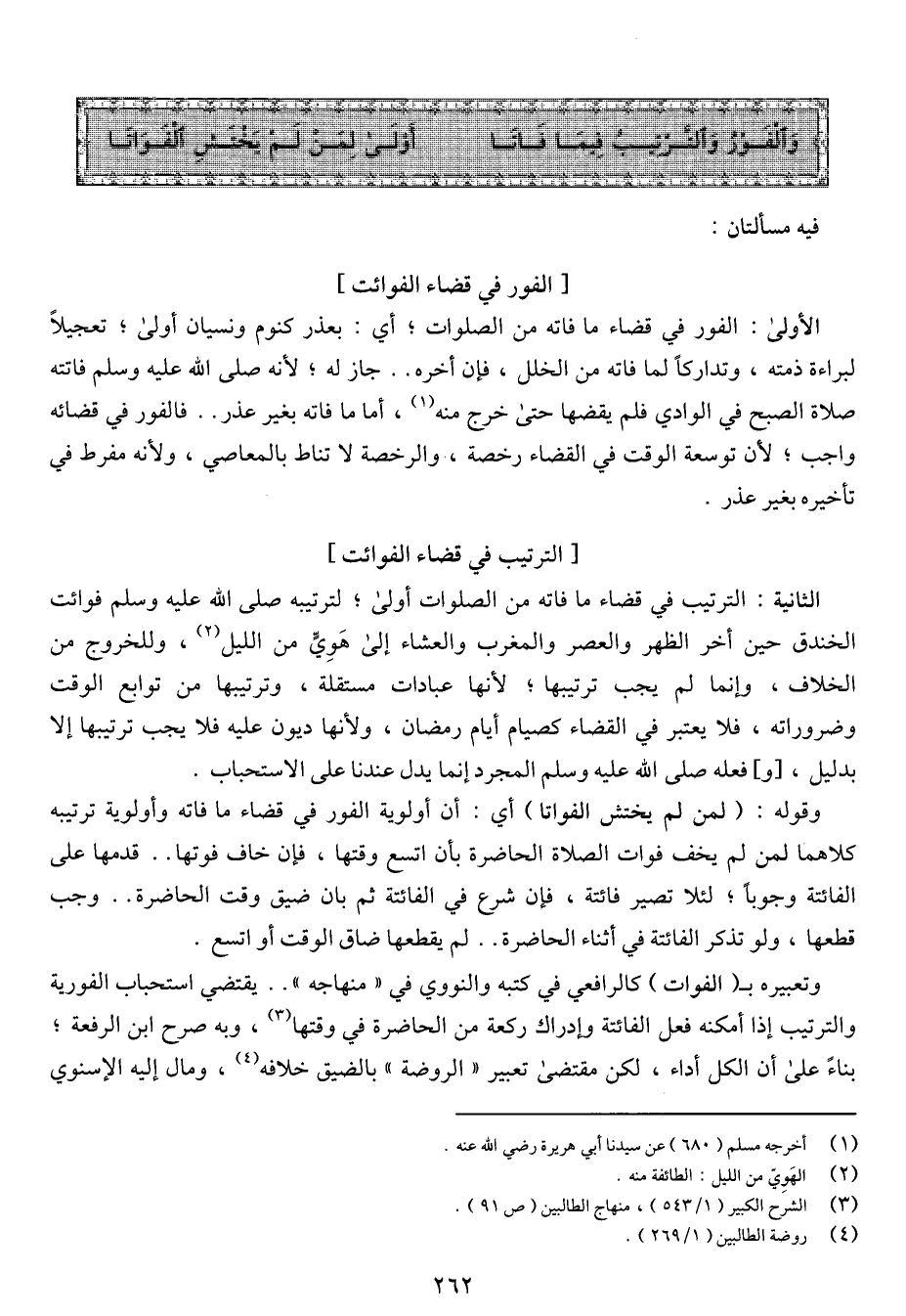 الأولى: الفور في قضاء ما فاته من الصلوات؛ أي: بعذر كنوم ونسيان أولى؛ تعجيلاً لبراءة ذمته، وتداركاً لما فاته من الخلل، فإن أخره .. جاز له؛ لأنه صلى الله عليه وسلم فاتته صلاة الصبح في الوادي فلم يقضها حتى خرج منه، أما ما فاته بغير عذر .. فالفور في قضائه واجب؛ لأن توسعة الوقت في القضاء رخصة، والرخصة لا تناط بالمعاصي، ولأنه مفرط في تأخير بغير عذر.