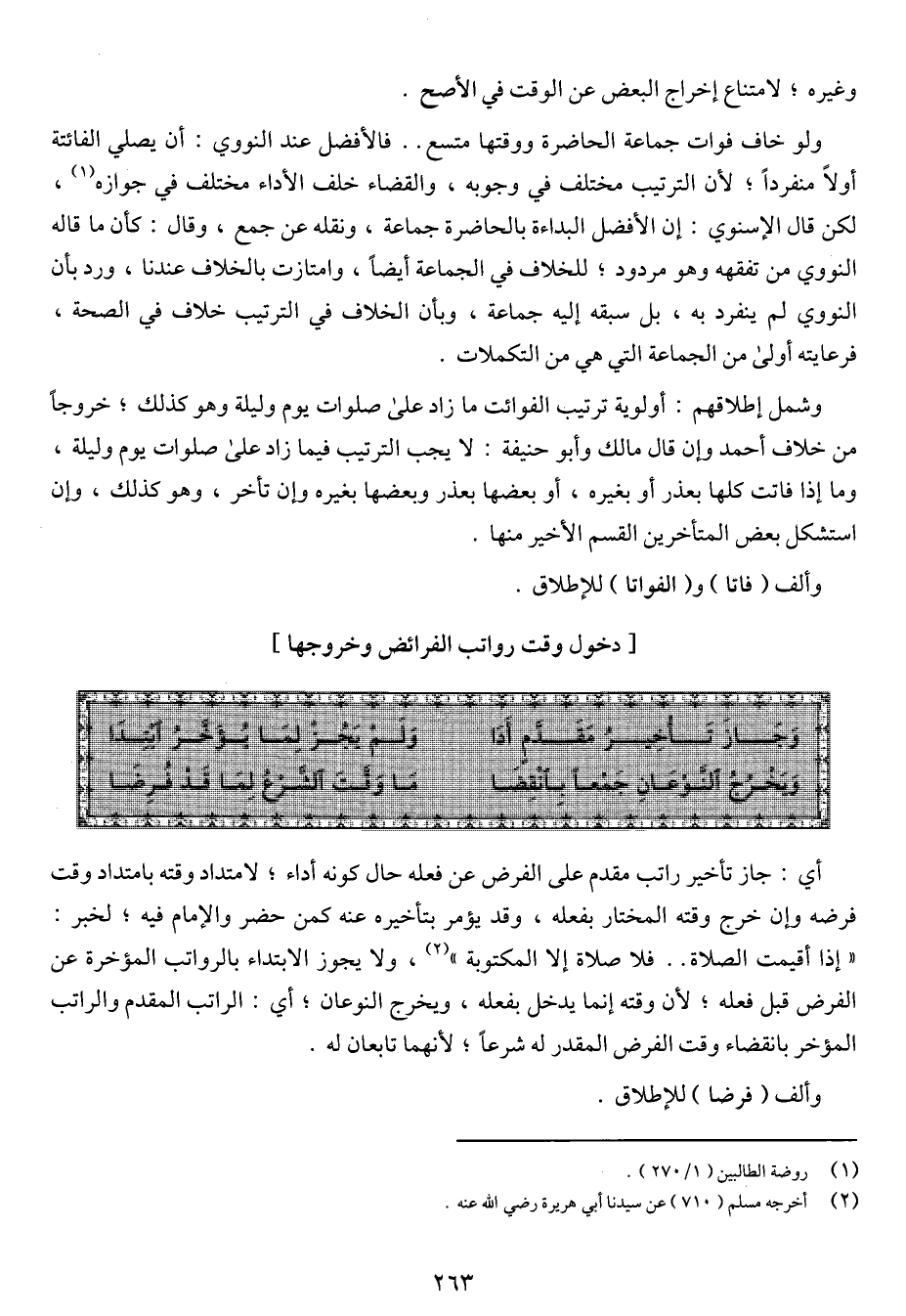 "إذا أقيمت الصلاة .. فلا صلاة إلا المكتوبة"، ولا يجوز الابتداء بالرواتب المؤخرة عن الفرض قبل فعله؛ لأن وقته إنما يدخل بفعله، ويخرج النوعان؛ أي: الراتب المقدم والراتب المؤخر بانقضاء وقت الفرض المقدر له شرعاً؛ لأنهما تابعان له.