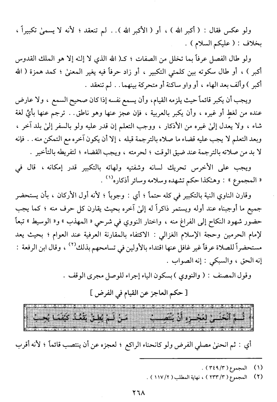 ويجب أن يكبر قائماً حيث يلزمه القيام، وأن يسمع نفسه إذا كان صحيح السمع، ولا عارض عنده من لغط أو غيره، وأن يكبر بالعربية، فإن عجز عنها وهو ناطق .. ترجم عنها بأي لغة شاء، ولا يعدل إلى غيره من الأذكار، ووجب التعلم إن قدر عليه ولو بالسفر إلى بلد آخر، وبعد التعليم لا يجب عليه قضاء ما صلاة بالترجمة قبله، إلا أن يكون آخره مع التمكين منه .. فإنه لابد من صلاته بالترجمة عند ضيق الوقت؛ لحرمته، ويجب القضاء؛ لتفريطه بالتأخير.