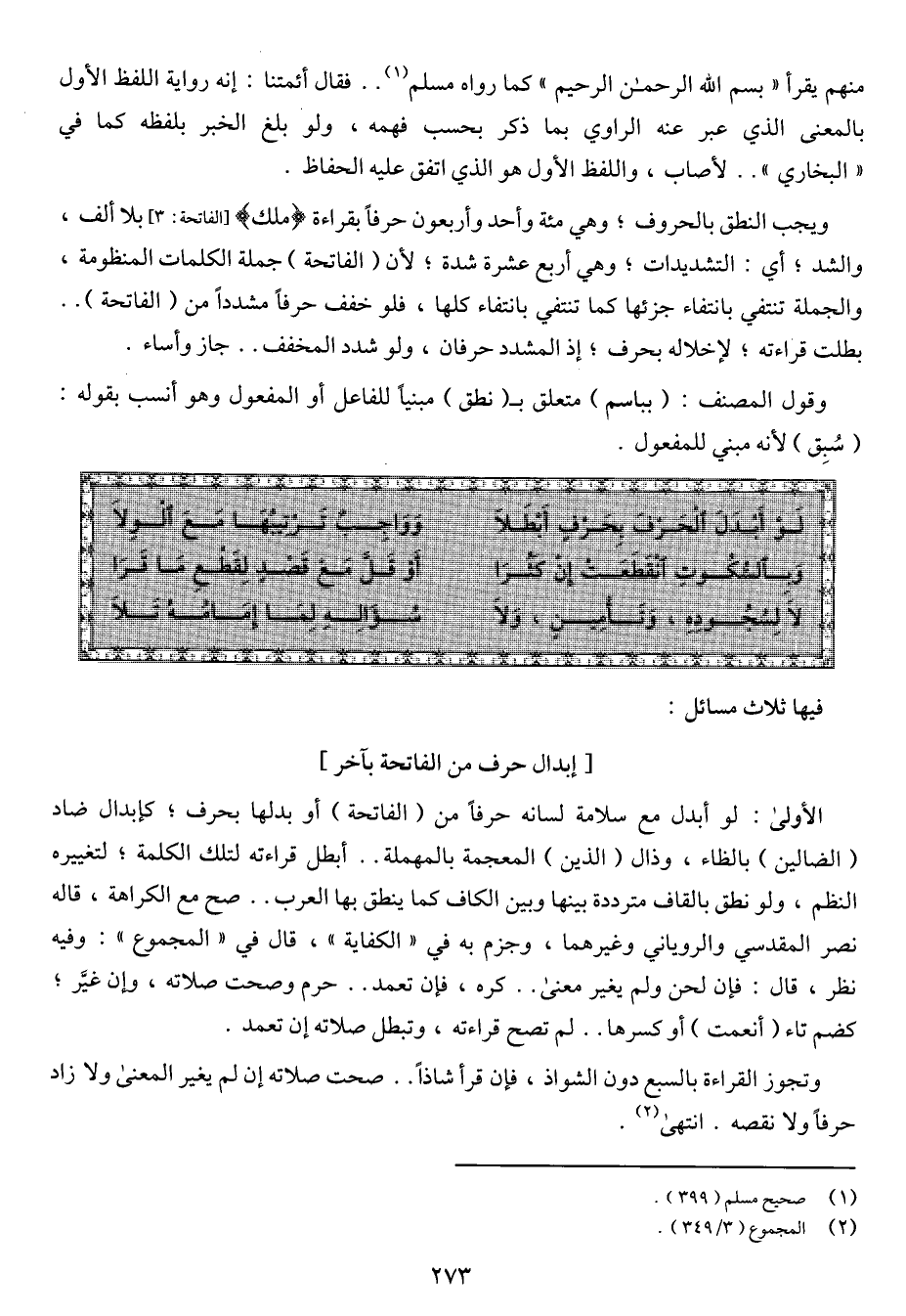 الأولى: لو أبدل مع سلامة لسانه حرفاً من (الفاتحة) أو بدلها بحرف؛ كإبدال ضاد (الضالين) بالظاء، وذال (الذين) المعجمة بالمهملة .. أبطل قراءته لتلك الكلمة؛ لتغييره النظم، ولو نطق بالقاف مترددة بينهما وبين الكاف كما ينطق بها العرب .. صح مع الكراهة، قاله نصر المقدسي والروياني وغيرهما، وجزم به في "الكفاية"، قال في "المجموع": وفيه نظر، قال: فإن لحن ولم يغير معنى .. كره، فإن تعمد .. حرم وصحت صلاته، وإن غير؛ كضم تاء (أنعمت) أو كسرها .. لم تصح قراءته، وتبطل صلاته إن تعمد.