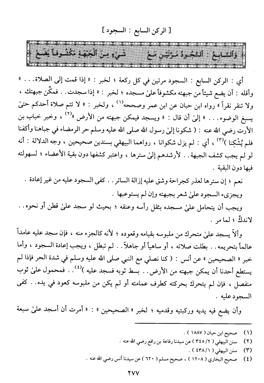 أي: الركن السابع: السجود مرتين في كل ركعة؛ لخبر: "إذا قمت إلى الصلاة ... " وأقله: أن يضع شيئاً من جبهته مكشوفاً على مسجده؛ لخبر: "إذا سجدت .. فمكن جبهتك، ولا تنقر نقراً" رواه ابن حبان عن ابن عمر وصححه، ولخبر: "لا تتم صلاة أحدكم حتى يسبغ الوضوء ... " إلى أن قال: "ويسجد فيمكن جبهته من الأرض"، وخبر خباب بن الأرت رضي الله عنه: (شكونا إلى رسول الله صلى الله عليه وسلم حر الرمضاء في جباهنا وأكفنا فلم يشكنا)، أي: لم يزل شكوانا، رواهما البيهقي بسندين صحيحين، وجه الدلالة: انه لو لم يجب كشف الجبهة .. لأرشدهم إلى سترها، واعتبر كشفها دون بقية الأعضاء؛ لسهولته فيها دون البقية.