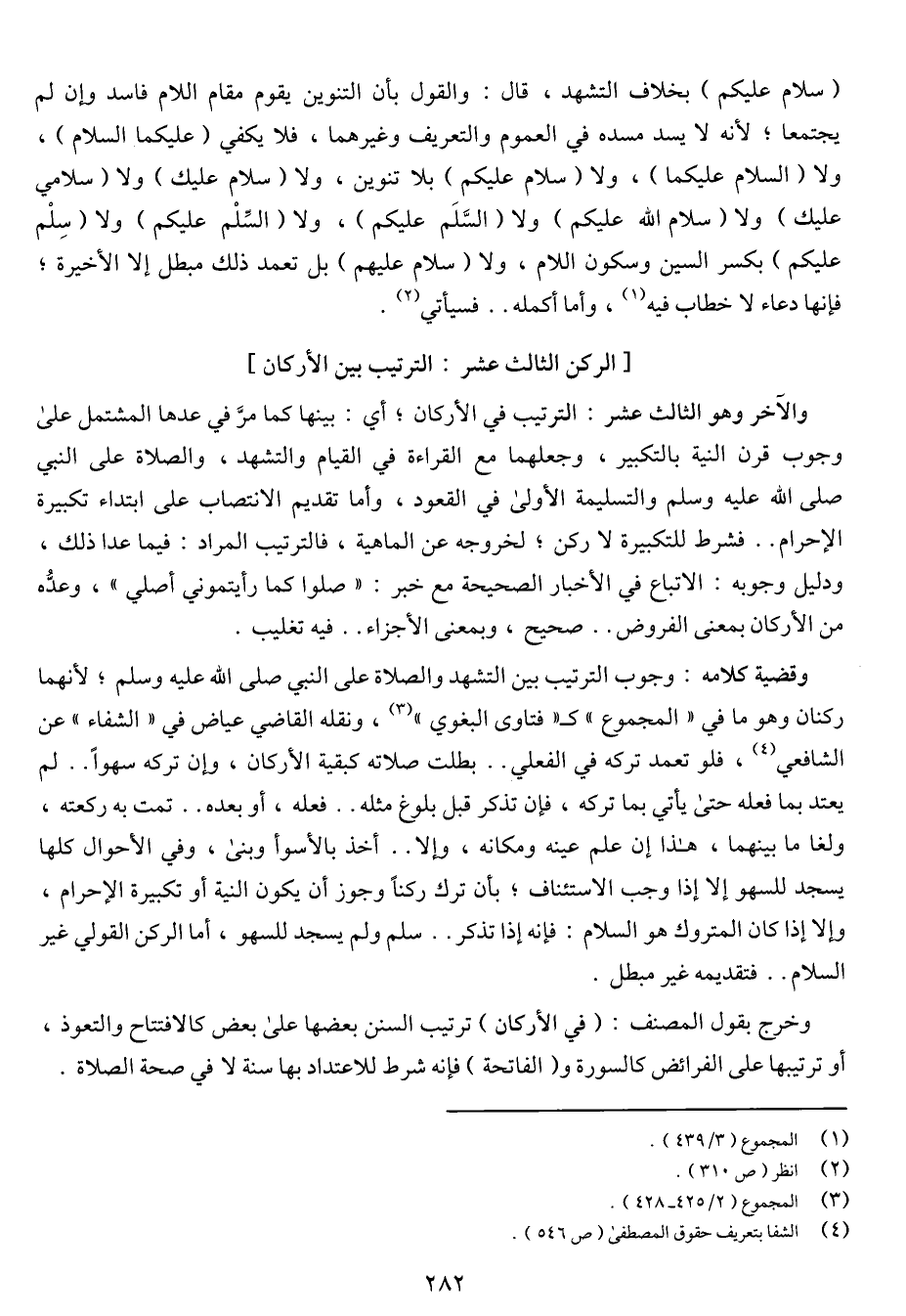 وقضية كلامه: وجوب الترتيب بين التشهد والصلاة على النبي صلى الله عليه وسلم؛ لأنهما ركنان وهو ما في "المجموع" كـ"فتاوى البغوي"، ونقله القاضي عياض في "الشفاء" عن الشافعي، فلو تعمد تركه في الفعلي .. بطلت صلاته كبقية الأركان، وإن تركه سهواً .. لم يعتد بما فعله حتى يأتي بما تركه، فإن تذكر قبل بلوغ مثله .. فعله، أو بعده .. تمت به ركعته، ولغا ما بينهما، هذا إن علم عينه ومكانه، وإلا .. أخذ بالأسوأ وبنى، وفي الأحوال كلها يسجد للسهو إلا إذا وجب الاستئناف؛ بأن ترك ركناً وجوز أن يكون النية أو تكبيرة الإحرام، وإلا إذا كان المتروك هو السلام: فإنه إذا تذكر .. سلم ولم يسجد للسهو، أما الركن القولي غير السلام .. فتقديمه غير مبطل.