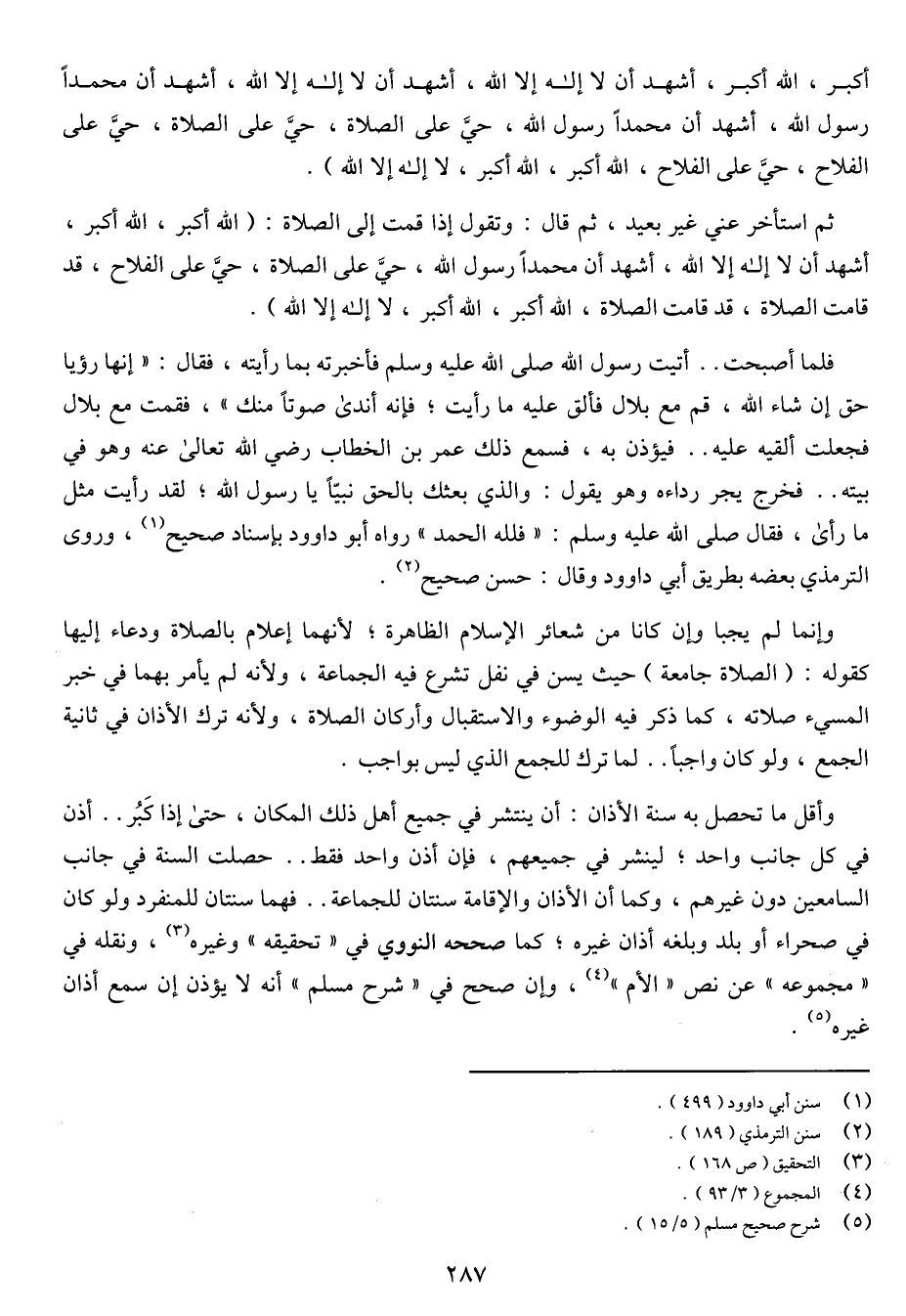 فلما أصبحت .. أتيت رسول الله صلى الله عليه وسلم فأخبرته بما رأيته، فقال: "إنها رؤيا حق إن شاء الله، قم مع بلال فألق عليه ما رأيت؛ فإنه أندى صوتاً منك"، فقمت مع بلال فجلعت ألقيه عليه .. فيؤذن به، فسمع ذلك عمر بن الخطاب رضي الله تعالى عنه وهو في بيته .. فخرج يجر رداءه وهو يقول: والذي بعثك بالحق نبياً يا رسول الله؛ لقد رأيت مثل ما رأى، فقال صلى الله عليه وسلم: "فلله الحمد" رواه أبو داوود بإسناد صحيح، وروى الترمذي بعضه بطريق أبي داوود وقال: حسن صحيح.