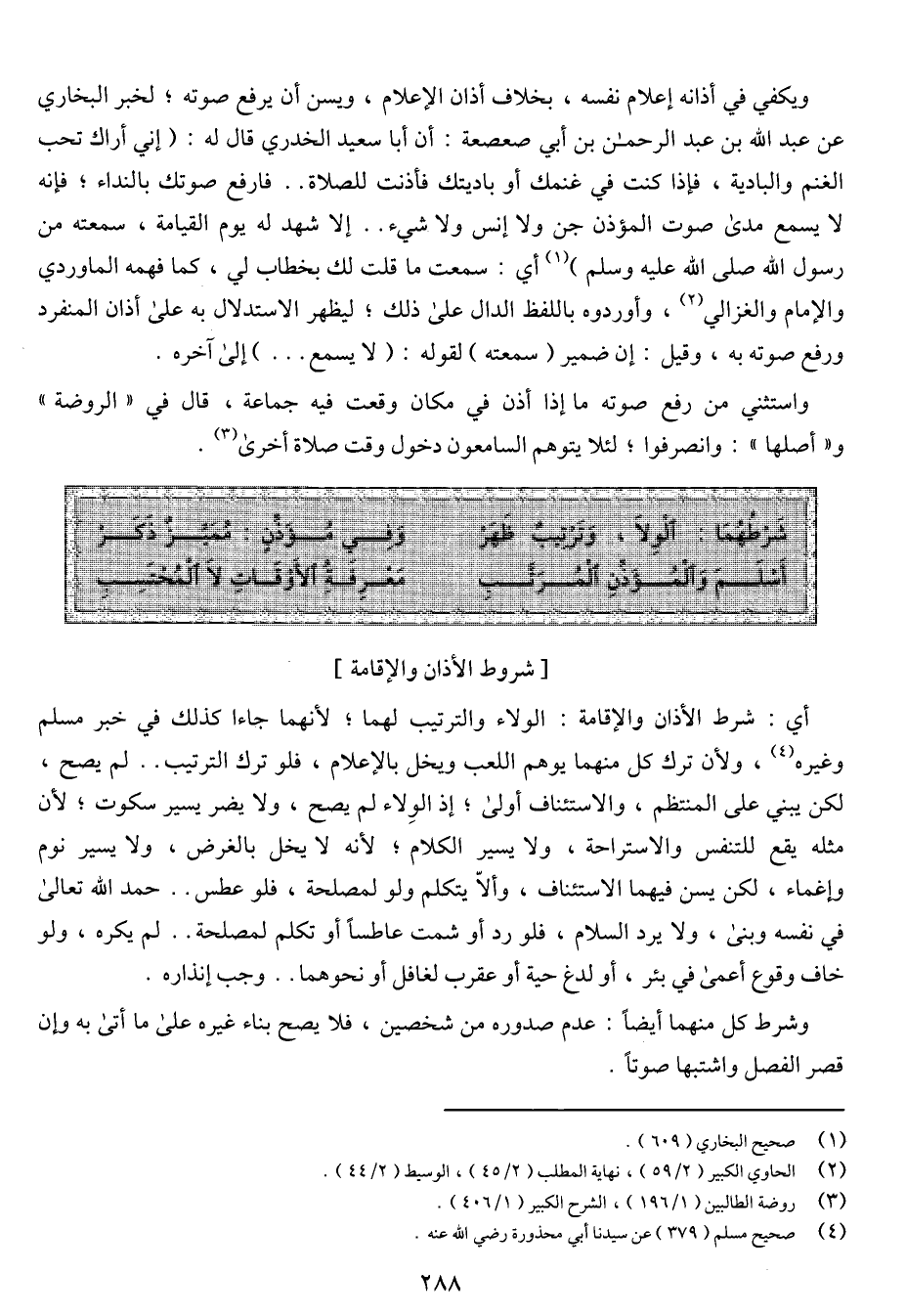 أي: شرط الأذان والإقامة: الولاء والترتيب لهما؛ لأنهما جاءا كذلك في خبر مسلم وغيره، ولأن ترك كل منهما يوهم اللعب ويخل بالإعلام، فلو ترك الترتيب .. لم يصح، لكن يبني على المنتظم، والاستئناف أولى؛ إذ الولاء لم يصح، ولا يضر يسير سكوت؛ لأن مثله يقع للتنفس والاستراحة، ولا يسير الكلام؛ لأنه لا يخل بالغرض، ولا يسير نوم وإغماء، لكن يسن فيهما الاستئناف، وألا يتكلم ولو لمصلحة، فلو عطس .. حمد الله تعالى في نفسه وبنى، ولا يرد السلام، فلو رد أو شمت عاطساً أو تكلم لمصلحة .. لم يكره، ولو خاف وقوع أعمى في بئر، أو لدغ حية أو عقرب لغافل أو نحوهما .. وجب إنذاراه.