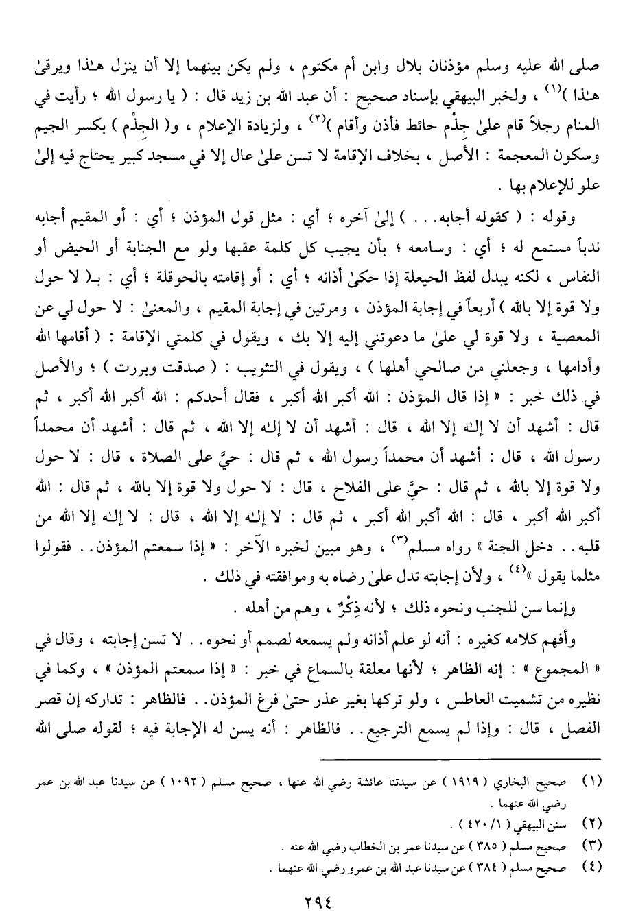 وأفهم كلامه كغيره: أنه لو علم أذانه ولم يسمعه لصمم أو نحوه .. لا تسن إجابته، وقال في "المجموع": إنه الظاهر؛ لأنها معلقة بالسماع في خبر: "إذا سمعتم المؤذن"، وكما في نظيره من تشميت العاطس، ولو تركها بغير عذر حتى فرغ المؤذن .. فالظاهر: تداركه إن قصر الفصل، قال: وإذا لم يسمع الترجيع .. فالظاهر: أنه يسن له الإجابة فيه؛ لقوله صلى الله