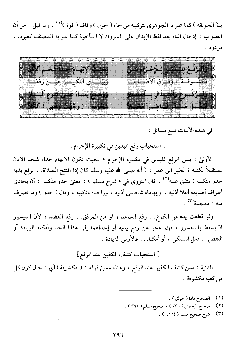 الأولى: يسن الرفع لليدين في تكبيرة الإحرام؛ بحيث تكون الإبهام حذاء شحم الأذن مستقبلاً بكفيه؛ لخبر ابن عمر: (أنه صلى الله عليه وسلم كان إذا افتتح الصلاة .. يرفع يديه حذو منكبيه) متفق عليه، قال النووي في "شرح مسلم": معنى حذو منكبيه، وذال (حذو) ما تصرف منه: معجمة.