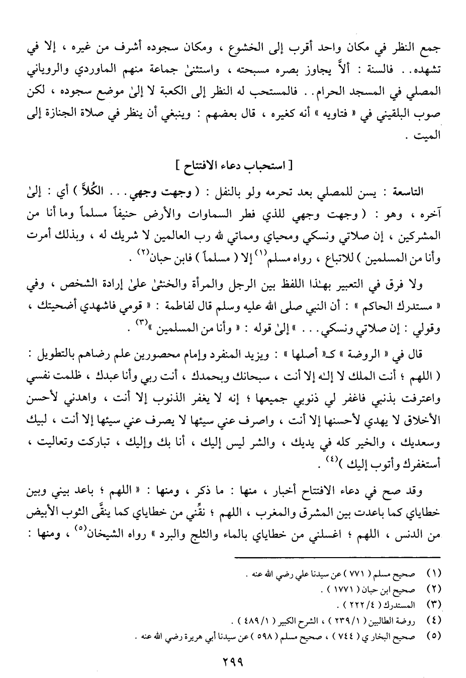 التاسعة: يسن للمصلي بعد تحرمه ولو بالنفل: (وجهت وجهي ... الكلا) أي: إلى آخره، وهو: (وجهت وجهي للذي فطر السماوات والأرض حنيفاً مسلماً وما أنا من المشركين، إن صلاتي ونسكي ومحياي ومماتي لله رب العالمين لا شريك له، وبذلك أمرت وأنا من المسلمين) للاتباع، رواه مسلم إلا (مسلماً) فابن حبان.