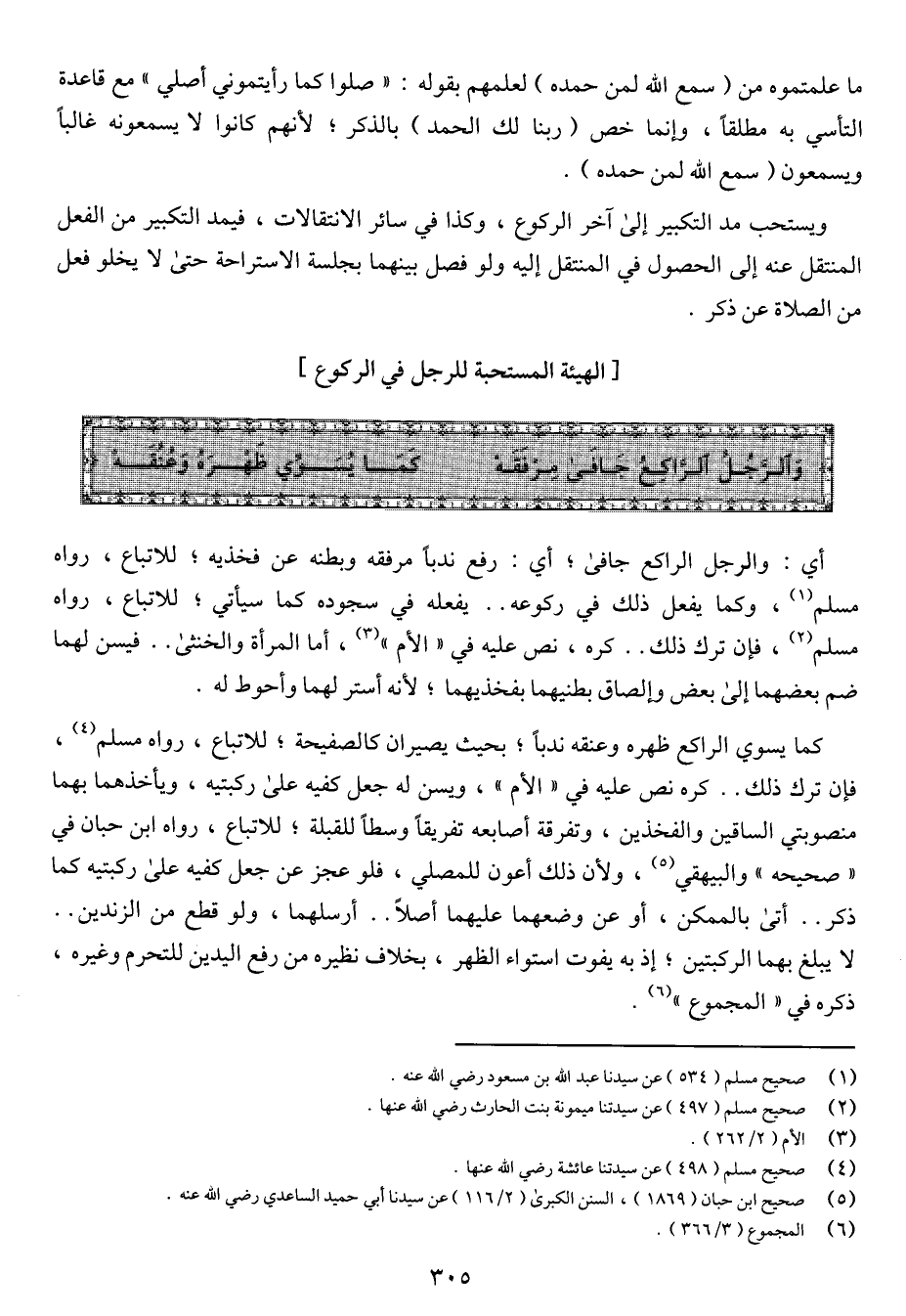 كما يسوي الراكع ظهره وعنقه ندباً؛ بحيث يصيران كالصفيحة؛ للاتباع, رواه مسلم, فإن ترك ذلك .. كره نص عليه في "الأم" ويسن هـ جعل كفيه على ركبتيه، ويأخذهما بهما منصوبتي الساقين والفخذين، وتفرقة أصابعه تفريقاً وسطاً للقبلة؛ للاتباع، رواه ابن حبان في "صحيحه" والبيهقي، ولأن ذلك أعون للمصلي، فلو عجز عن جعل كفيه على ركبتيه كما ذكر .. أتى بالممكن، أو عن وضعهما عليهما أصلاً .. أرسلهما، ولو قطع من الزندين .. لا يبلغ بهما الركبتين؛ إذ به يفوت استواء الظهر، بخلاف نظيره من رفع اليدين للتحرم وغيره، ذكره في "المجموع".