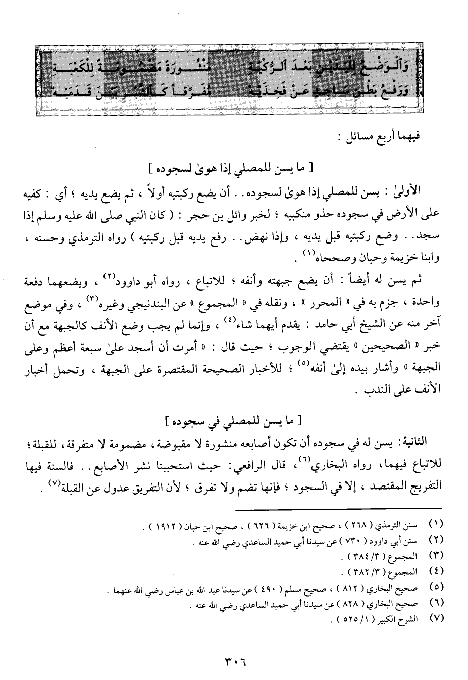 الأولى: يسن للمصلي إذا هوى لسجوده .. أن يضع ركبتيه أولاً، ثم يضع يديه؛ أي: كفيه على الأرض في سجوده حذو منكبيه؛ لخبر وائل بن حجر: (كان النبي صلى الله عليه وسلم إذا سجد .. وضع ركبتيه قبل يديه، وإذا نهض .. رفع يديه قبل ركبتيه) رواه الترمذي وحسنه، وابنا خزيمة وحبان وصححاه.