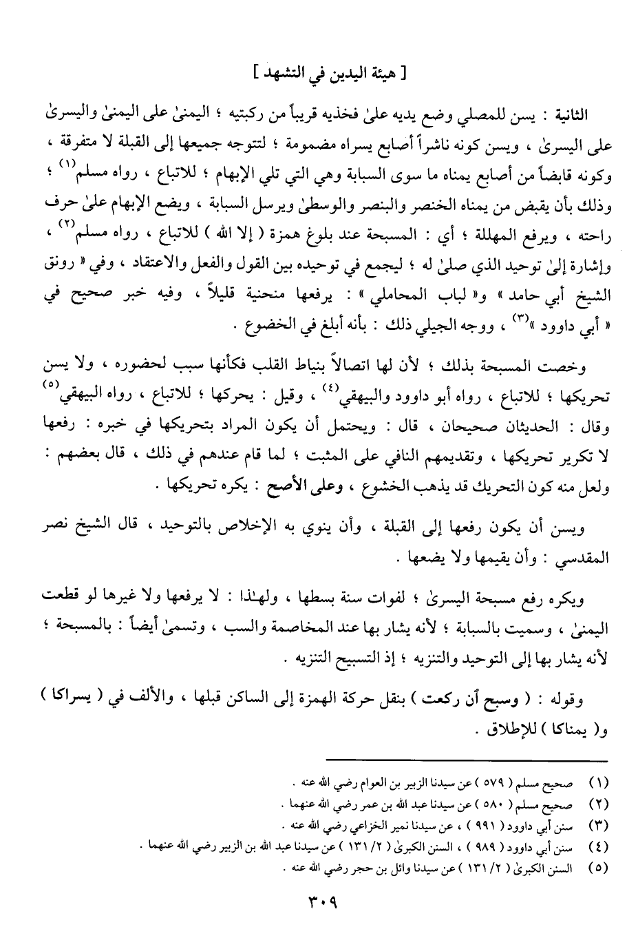 الثانية: يسن للمصلي وضع يديه على فخذيه قريباً من ركبتيه؛ اليمنى على اليمنى واليسرى على اليسرى، ويسن كونه ناشراً اصابع يسراه مضمومة؛ لتتوجه جميعها إلى القبلة لا متفرقة، وكونه قابضاً من أصابع يمناه ما سوى السبابة وهي التي تلي الإبهام؛ للاتباع، رواه مسلم؛ وذلك بأن يقبض من يمناه الخنصر والبنصر والوسطى ويرسل السبابة، ويضع الإبهام على حرف راحته، ويرفع المهللة؛ أي: المسبحة عند بلوغ همزة (إلا الله) للاتباع، رواه مسلم، وإشارة إلى توحيد الذي صلى له؛ ليجمع في توحيده بين القول والفعل والاعتقاد، وفي "رونق الشيخ أبي حامد" و"لباب المحاملي" يرفعها منحنية قليلاً، وفيه خبر صحيح في "أبي داود"، ووجه الجيلي ذلك: بأنه أبلغ في الخضوع.