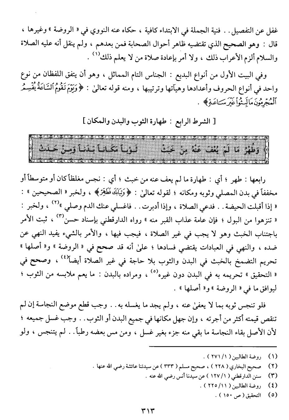 رابعها: طهر، أى طهارة ما لم يعف عنه من خبث، أى: نجس مغلظا كان أو متوسطا أو مخففا في بدن المصلي وثوبه ومكانه، لقوله تعالى: {وثيابك فطهر} [سورة المدثر: 4]، ولخبر (الصحيحين): (إذا أقبلت الحيضة .. فدعي الصلاة، وإذا أدبرت .. فاغسلي عنك الدم وصلي)، ولخبر: (تنزهوا من البول، فإن عامة عذاب القبر منه) رواه الدارقطني بإسناد حسن، ثبت الأمر باجتناب الخبث وهو لا يجب في غير الصلاة فيجب فيها، والأمر بالشئ يفيد النهى عن ضده، والنهي في العبادات يقتضي فسادها، على أنه قد صحح في (الروضة) و (أصلها) تحريم التضمخ بالخبث في البدن والثوب بلا حاجة في غير الصلاة أيضا، وصحح في (التحقيق) تحريمه به في البدن دون غيره، ومراده بالبدن: ما يعم ملابسه من الثوب، ليوافق ما في (الروضة) و (أصلها).