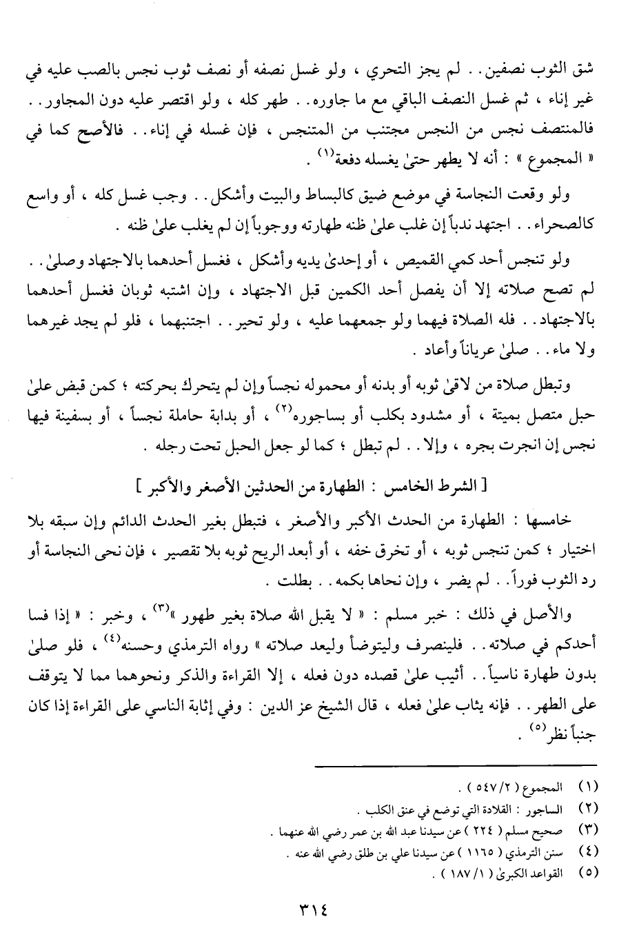 خامسها: الطهارة من الحدث الأكبر والصغر، فتبطل بغير الحدث الدائم وغن سبقه بلا اختيار، كمن تنجس ثوبه، أو تخرق خفه، أو أبعد الريح ثوبه بلا تقصير، فإن نحى النجاسة أو رد الثوب فورا .. لم يضر، وإن نحاها بكمه .. بطلت.