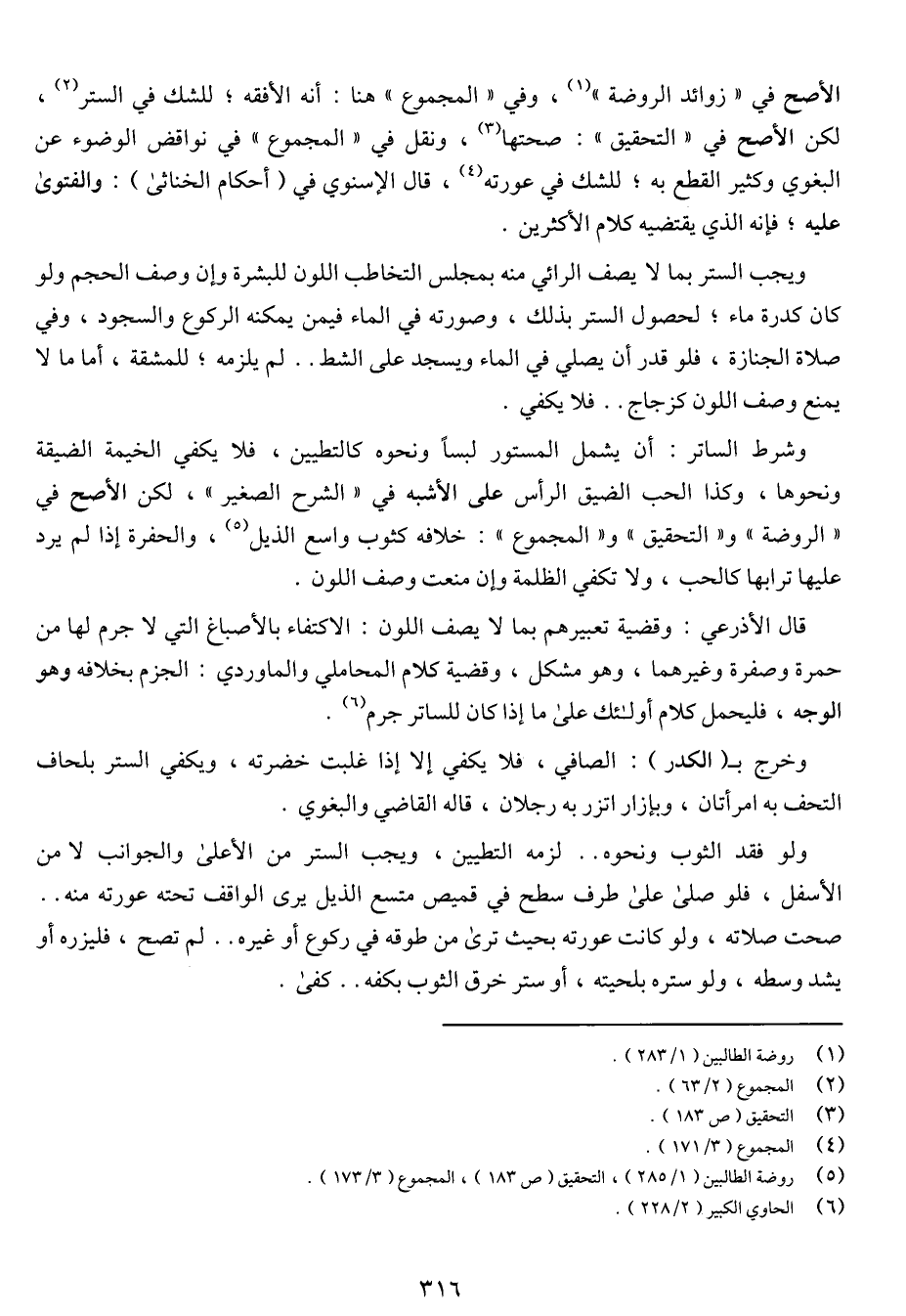 وشرط الساتر: أن يشمل المستور لبسا ونحوه كالتطيين، فلا يكفي الخيمة الضيقة ونحوها، وكذا الحب الضيق الرأس على الأشبه في (الشرح الصغير)، لكن الأصح في (الروضة) و (التحقيق) و (المجموع): خلافه كثوب واسع الذيل، والحفرة إذا لم يرد عليها ترابها كالحب، ولا تكفي الظلمة وإن منعت وصف اللون.