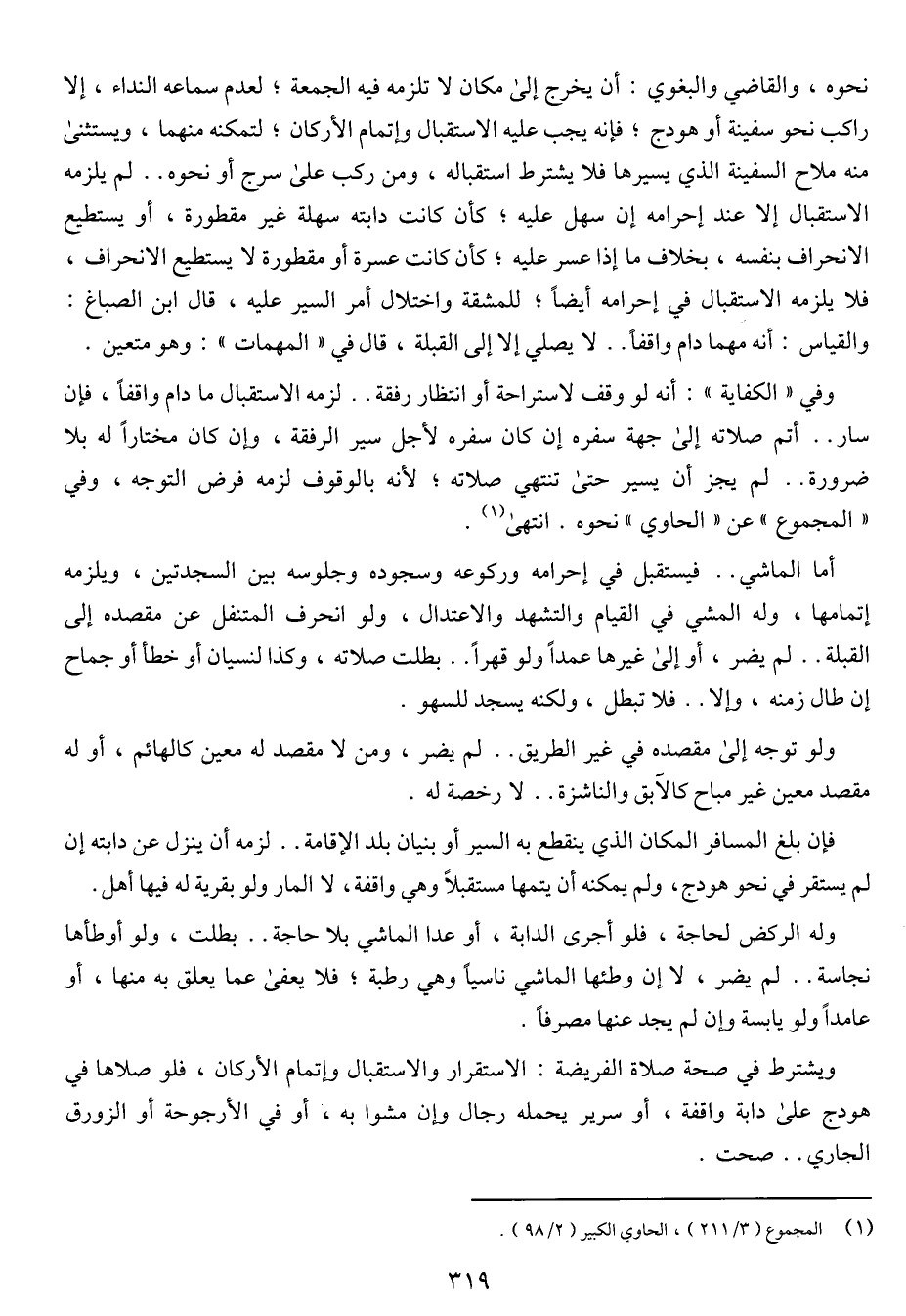 وفي (الكفاية): أنه لو وقف لاستراحة أو انتظار رفقة ... لزمه الاستقبال ما دام واقفا، فإن سار .. أتم صلاته إلى جهة سفره إن كان سفره لأجل سير الرفقة، وإن كان مختارا له بلا ضرورة .. لم يجز أن يسير حتى تنتهي صلاته، لأنه بالوقوف لزمه فرض التوجه، وفي (المجموع) عن (الحاوي) نحوه. انتهى.