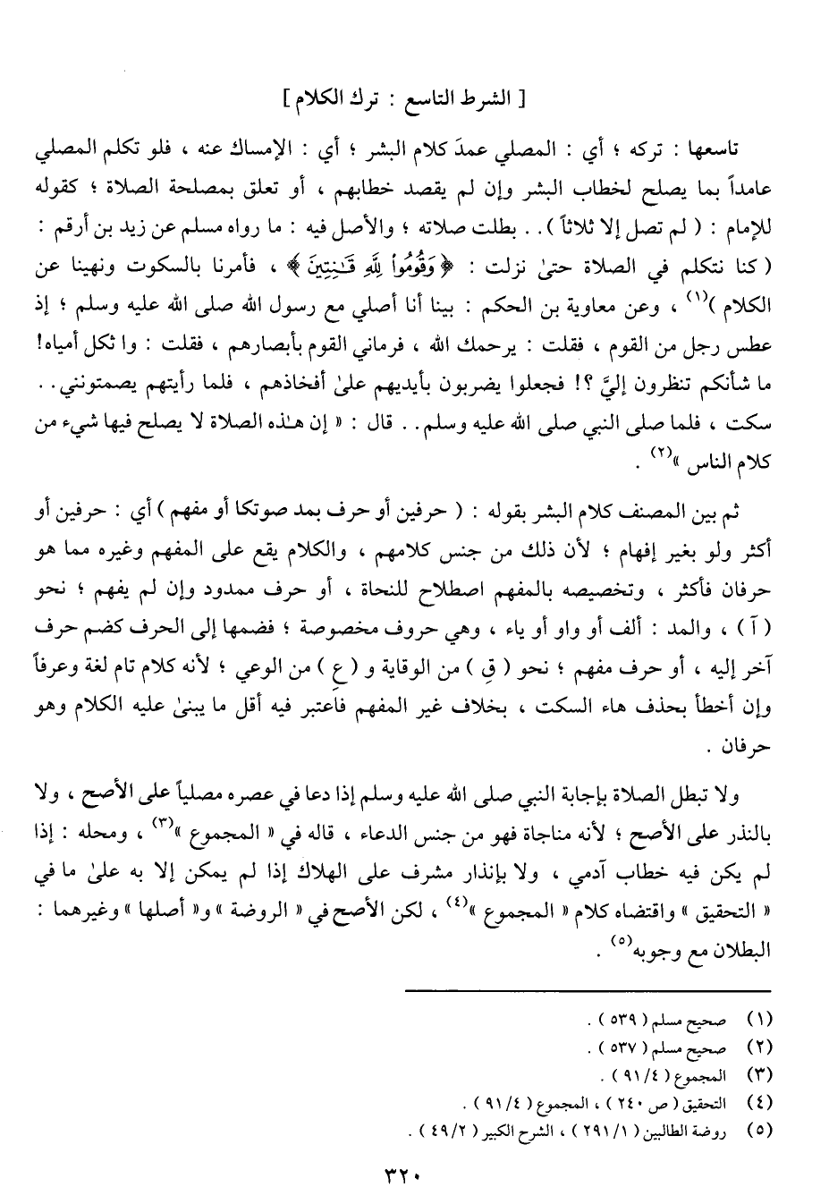 تاسعها: تركه، أي: المصلي عمد كلام البشر، أى: الإمساك عنه، فلو تكلم المصلي عامدا بما يصلح لخطاب البشر وإن لم يقصد خطابهم، أو تعلق بمصلحة الصلاة، كقوله للإمام: (لم تصل إلا ثلاثا) .. بطلت صلاته، والأصل فيه: ما رواه مسلم عن زيد بن أرقم: (كنا نتكلم في الصلاة حتى نزلت {وقوموا لله قانتين} [سورة البقرة: 238]، فأمرنا بالسكوت ونهينا عن الكلام)، وعن معاوية بن الحكم: بينا أنا أصلي مع رسول الله صلى الله عليه وسلم، إذ عطس رجل من القوم، فقلت: يرحمك الله، فرماني القوم بأبصارهم، فقلت: وا ثكل أمياه! ما شأنكم تنظرون إلي؟ ! فجعلوا يضربون بأيديهم على أفخاذهم، فلما رأيتهم يصمتونني .. سكت، فلما صلي النبي صلى الله عليه وسلم .. قال: (إن هذه الصلاة لا يصلح فيها شئ من كلام الناس).